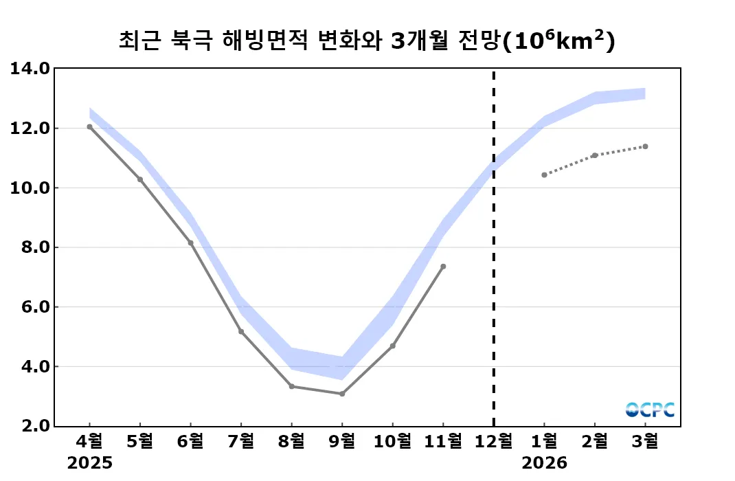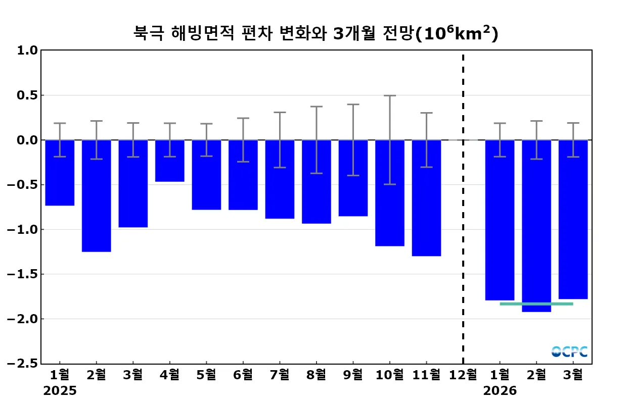 북극 2026년 1월~3월 평균 해빙면적은 평년(1,280만±20만km²)보다 작을 것으로 전망됩니다.