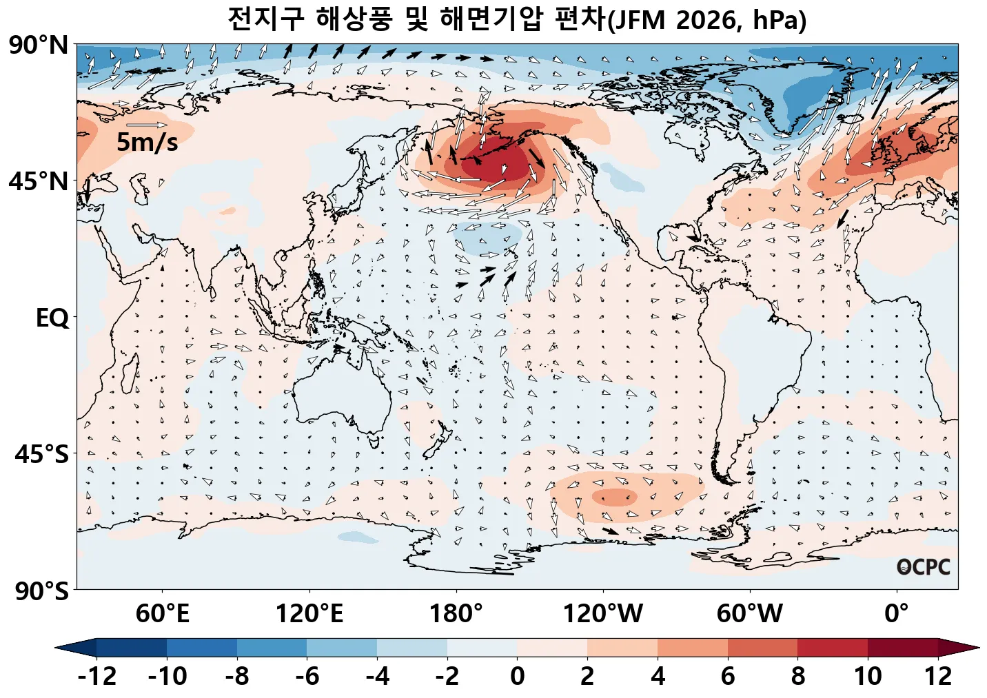 B. 전지구 해상풍 및 해면기압 편차 전망(2026년 1월~3월 평균, 흑색벡터: 평년 ±2 표준편차 초과해역)