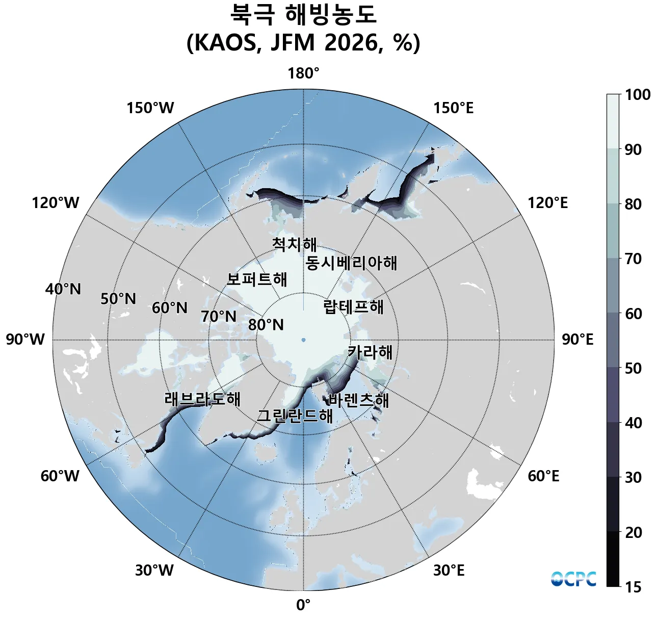 A. 북극 해빙농도 전망(2026년 1월~3월 평균, 15% 이상 해역)