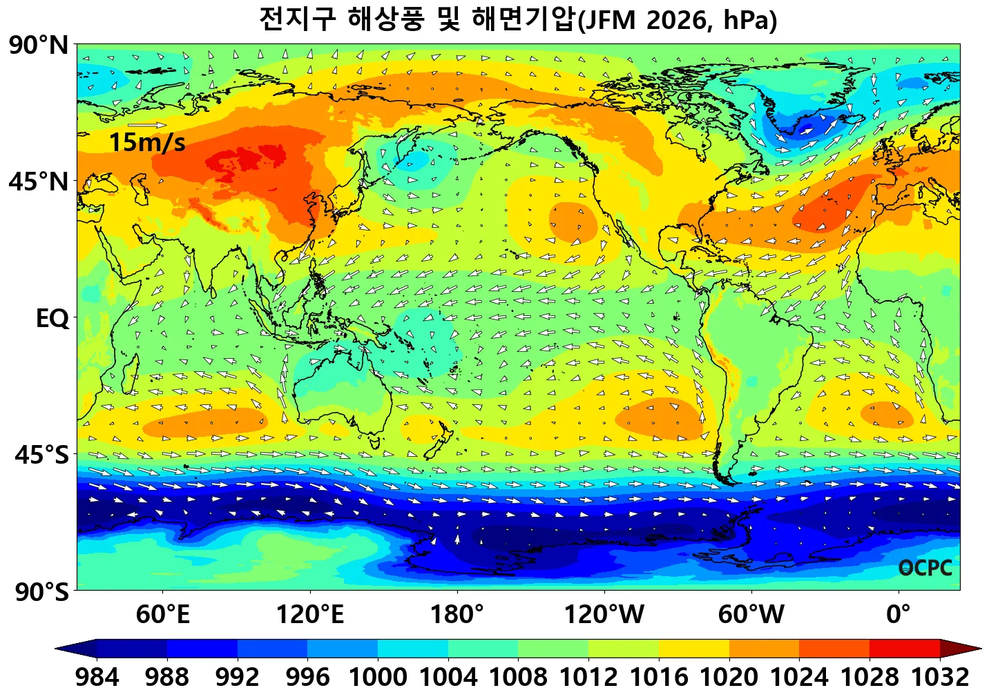 전지구 2026년 1월~3월 평균 해상풍속은 평년(4.8±0.1m/s)보다 강하겠습니다.