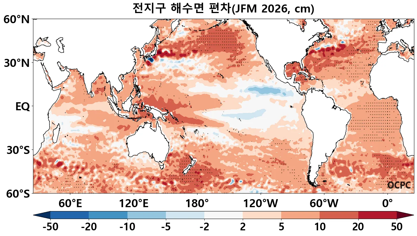 전지구 2026년 1~3월 평균 해수면은 평년(58±1cm)보다 높겠으며, 열대 동태평양을 제외한 대부분의 해역에서 양의 편차를 보이고 중위도 북태평양과 아열대 대서양 해역은 평년 2 표준편차를 초과하는 높은 해수면 편차가 전망됩니다.