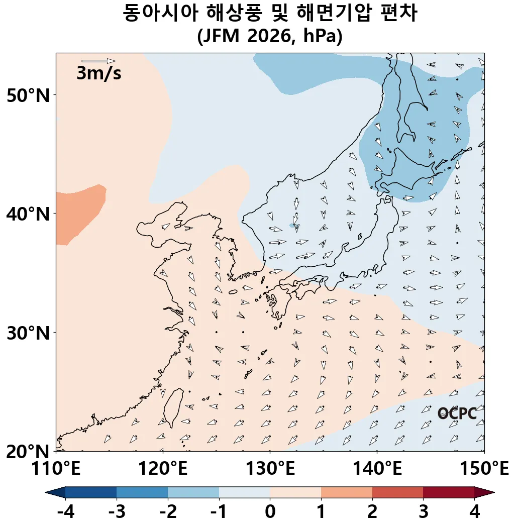 A+B. 동아시아 해상풍 및 해면기압 전망(2026년 1월~3월 평균)
