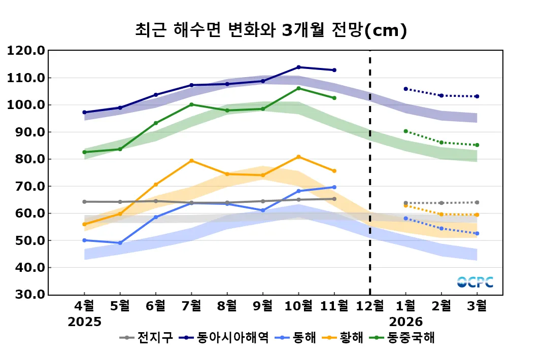 동해, 황해, 동중국해의 2026년 1~3월 평균 해수면은 평년(47±2cm, 54±2cm, 82±2cm)보다 높겠으며, 1월에서 3월로 갈수록 편차는 낮아질 것으로 전망됩니다.