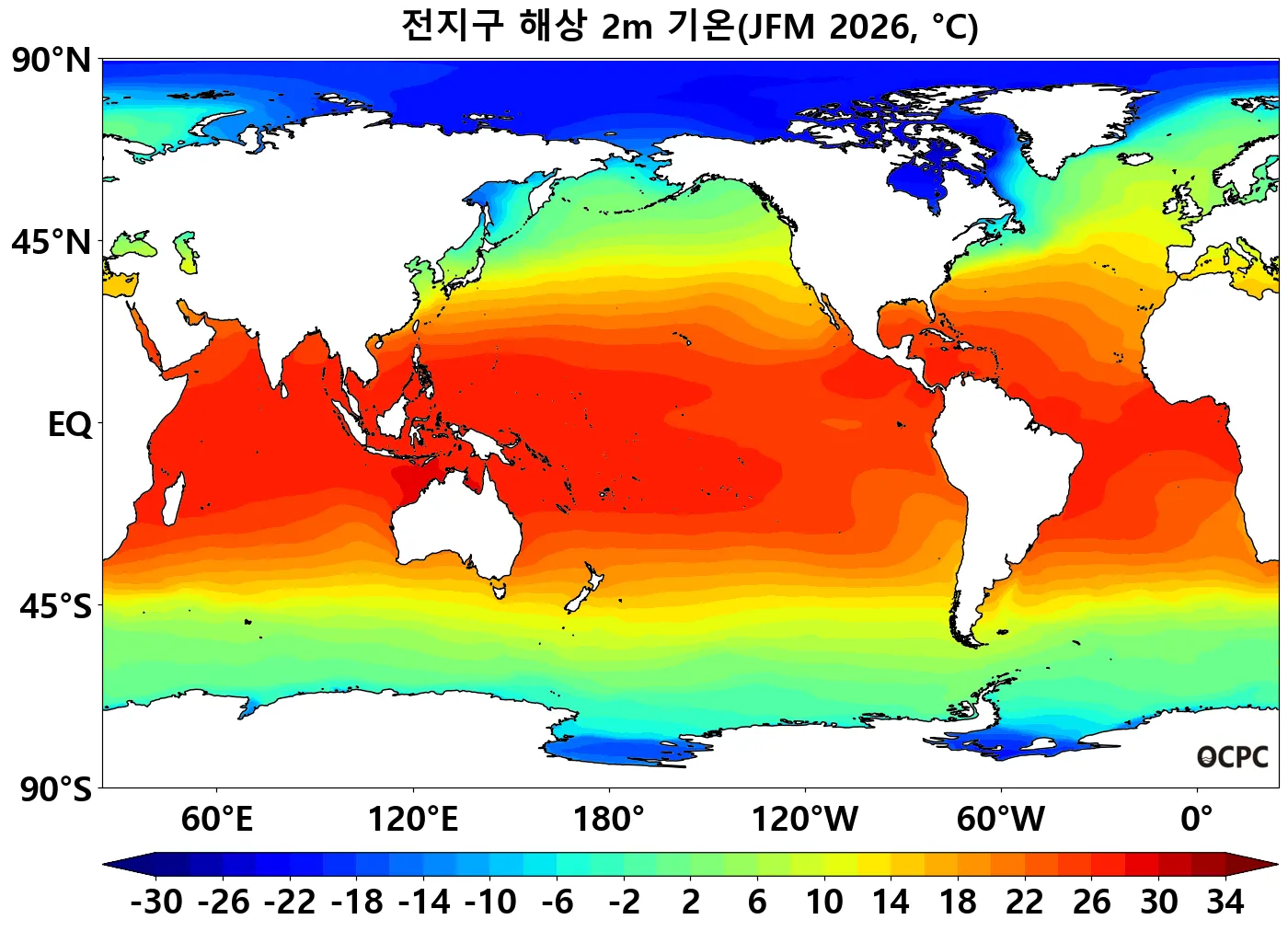 전지구 2026년 1월~3월 평균 해상기온은 평년(16.7±0.1℃)보다 높겠습니다.