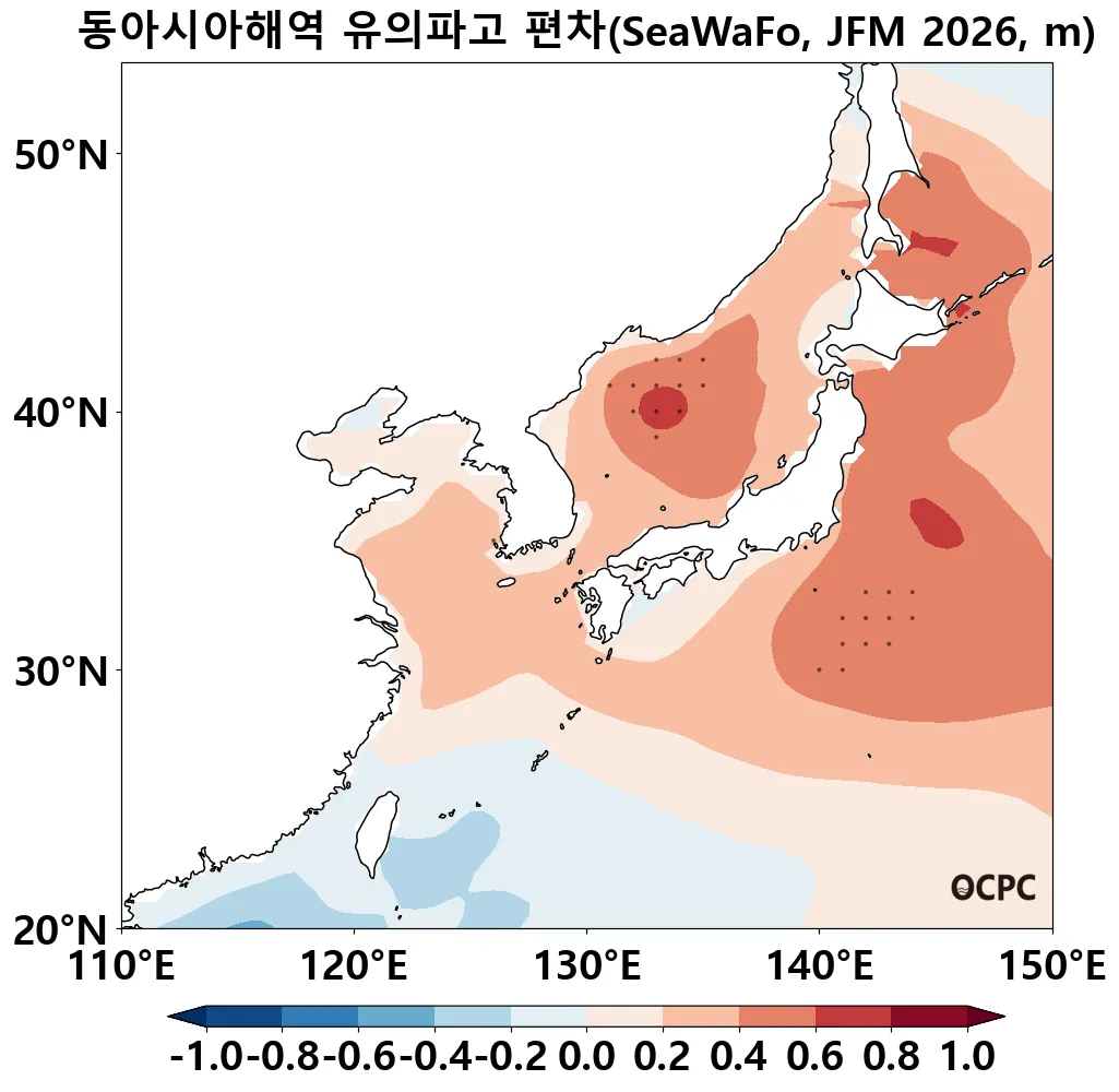 A-B. 동아시아해역 유의파고 편차 전망(2026년 1월~3월 평균, 점표시: 평년 ±2 표준편차 초과해역)
