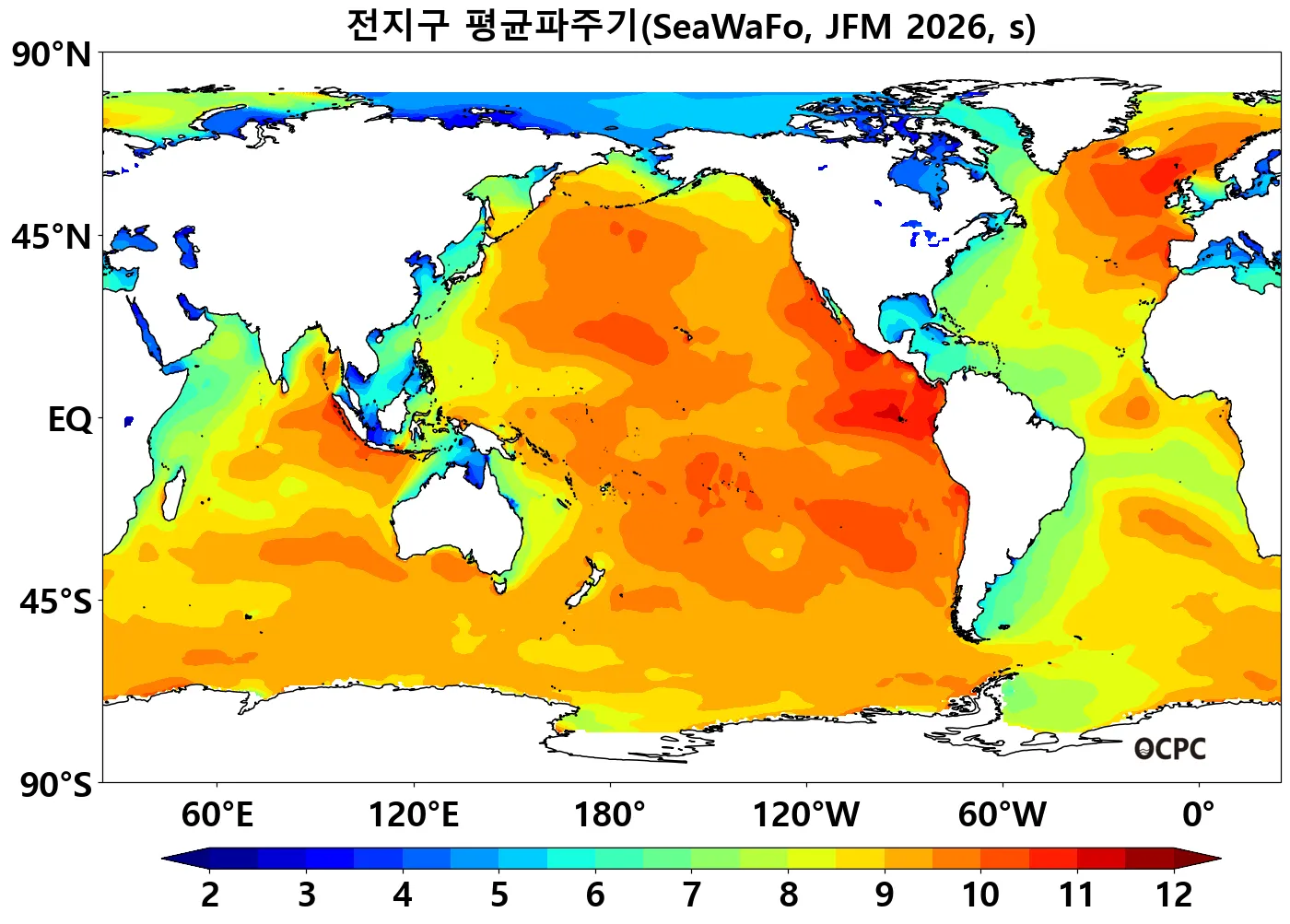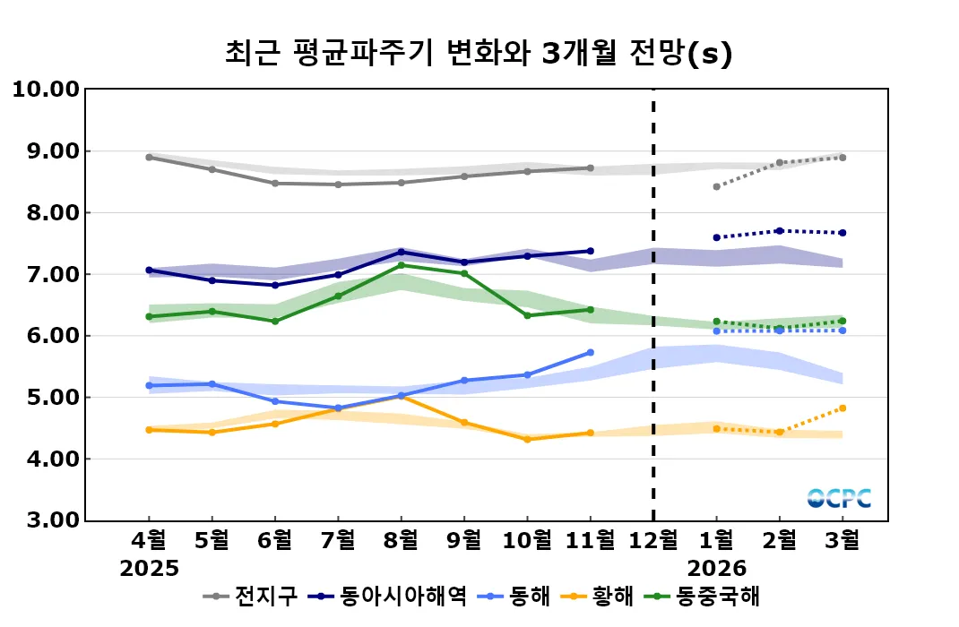전지구 2026년 1~3월 평균파주기는 평년(8.82±0.05초)보다 짧을 것으로 전망됩니다.