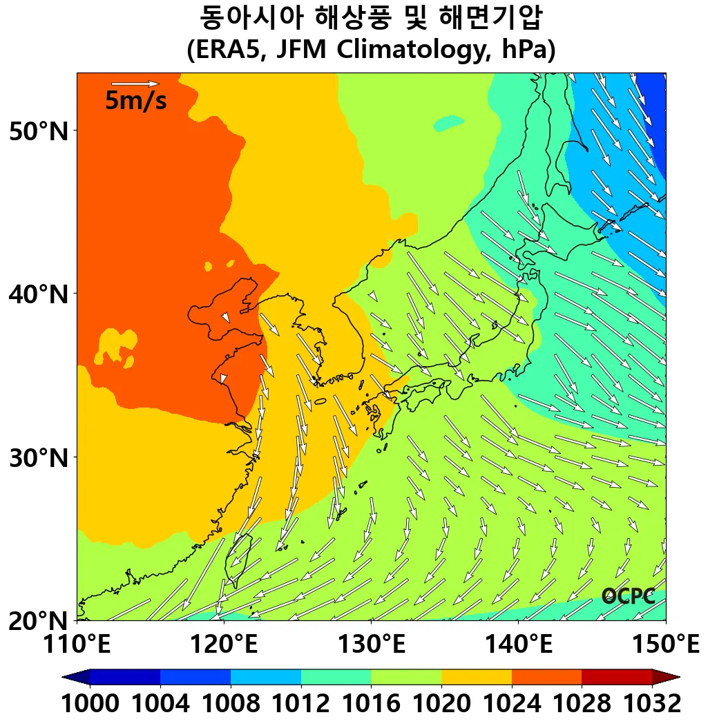 A. 동아시아 해상풍 및 해면기압(평년 1월~3월 평균)