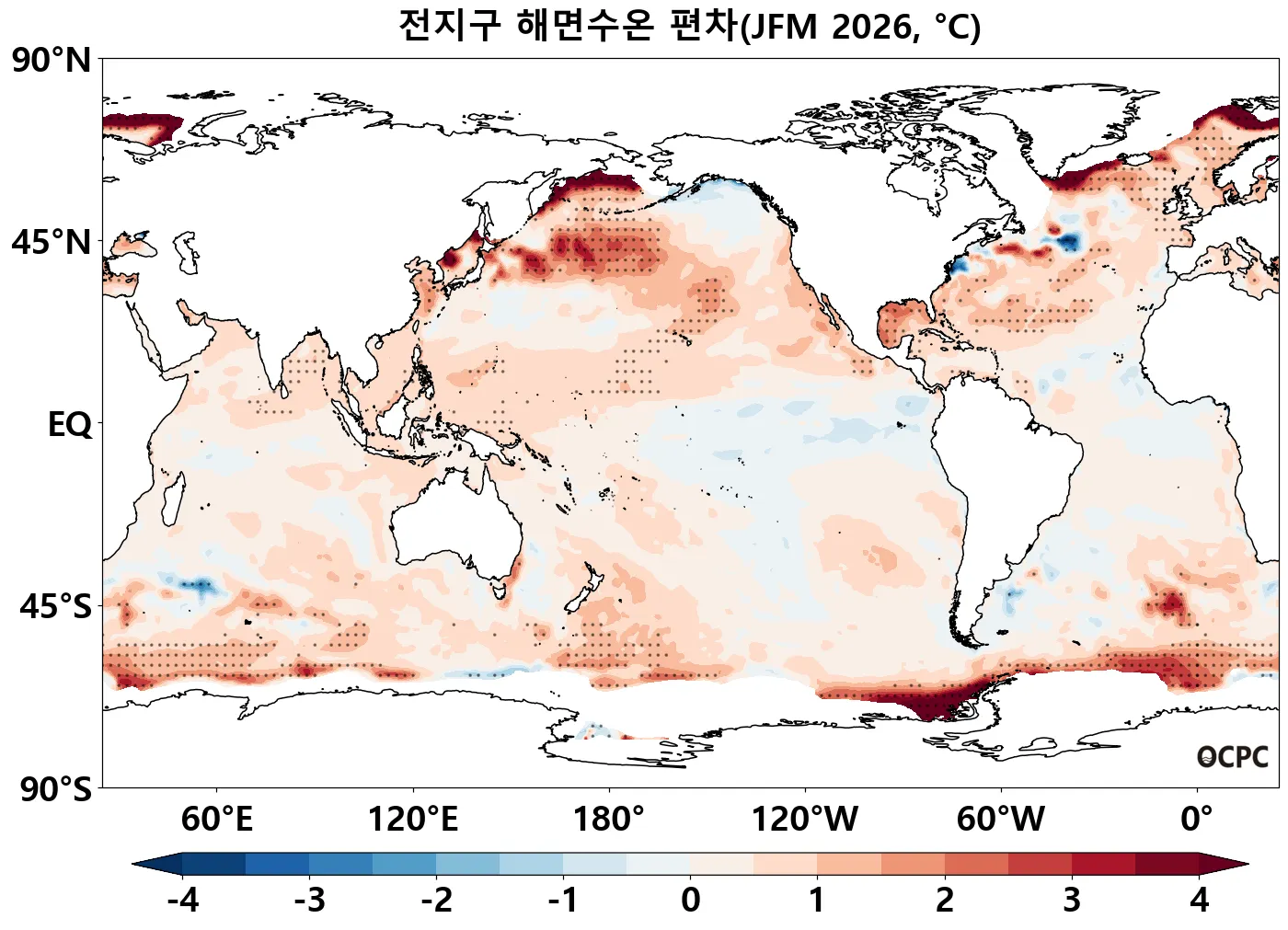 A-B. 전지구 해면수온 편차 전망(2026년 1월~3월 평균, 점표시: 평년 ±2 표준편차 초과해역)