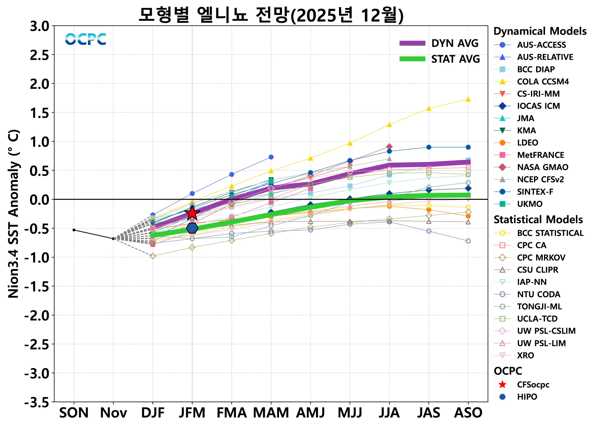 다양한 통계/역학 모형 결과(International Research Institute for Climate and Society, Columbia Univ.) 및 해양기후예측센터에서 산출된 Nino3.4 해역 해면수온 편차 전망