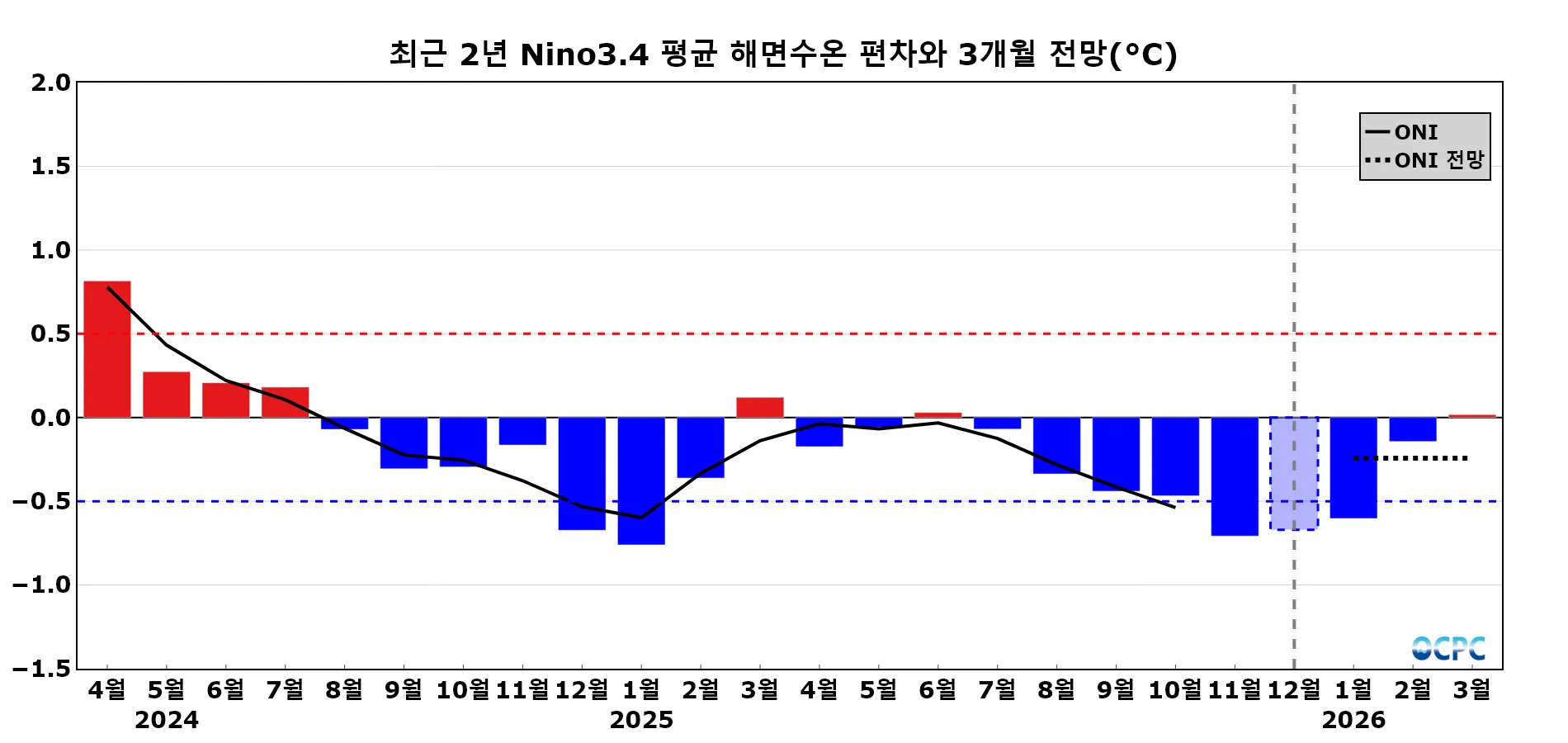 엘니뇨/라니냐 지수(ONI, Ocean Nino Index): 엘니뇨/라니냐 감시구역인 Nino3.4 해역의 월평균 해면수온 편차(채색부분)를 3개월 이동평균하여 나타낸 지수(검정색 실선)로 0.5보다 크면 엘니뇨, -0.5보다 작으면 라니냐로 판정합니다. 과거 지수(최근 2년)는 OISSTv2.1, 전망은 CFSv2 자료에서 산출하였으며, 검정색 점선은 3개월 전망의 평균값을 나타내고 투명도가 있는 막대 그래프는 1일부터 20일까지의 평균값(OISSTv2.1)을 의미합니다.