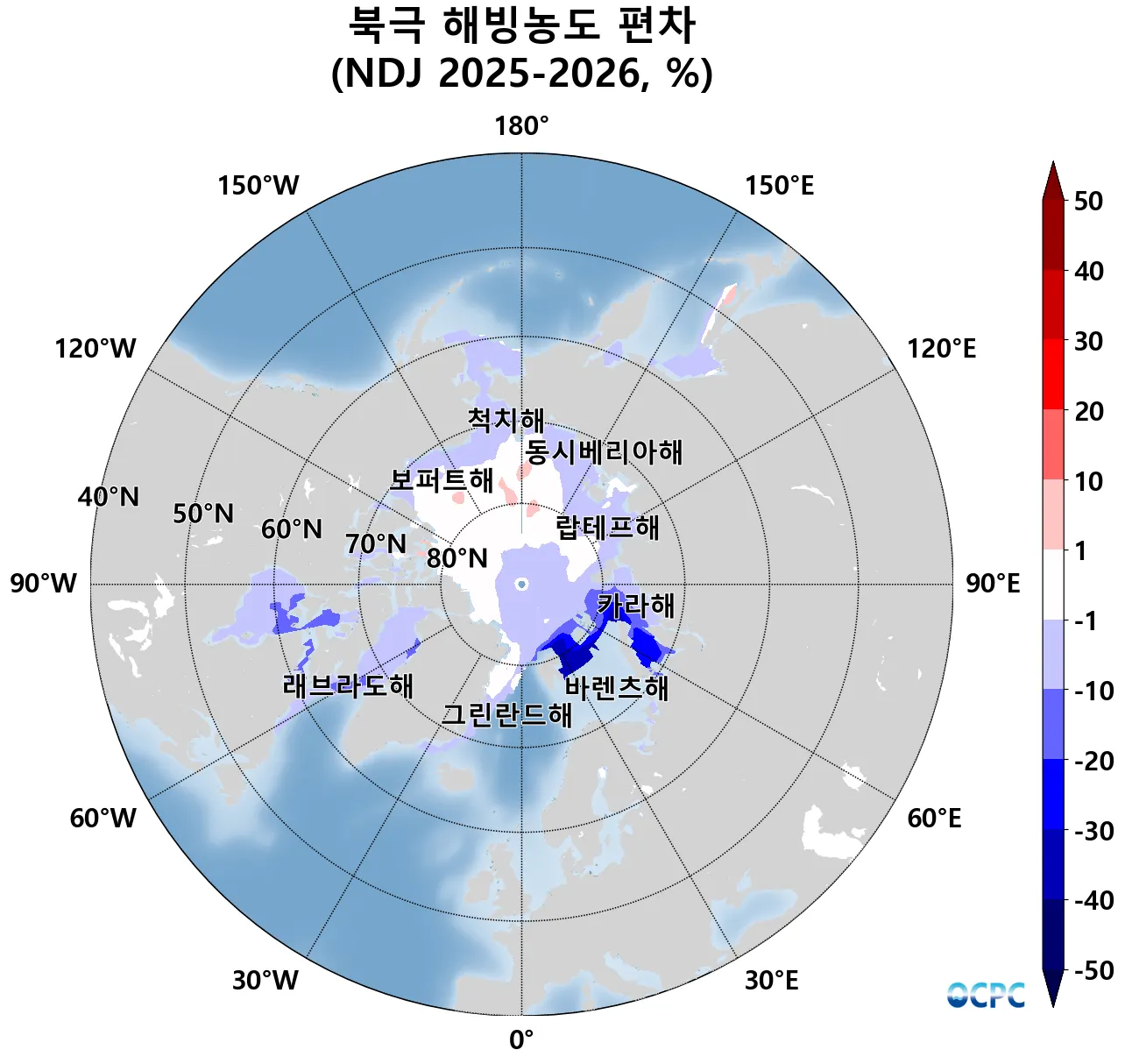 A-B. 북극 해빙농도 편차 전망(2025년 11월~2026년 1월 평균, 15% 이상 해역)