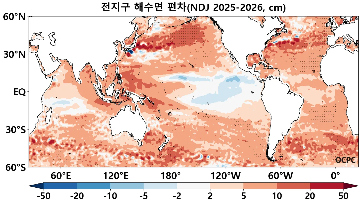 전지구 2025년 11월 ~ 2026년 1월 평균 해수면은 평년(59±1cm)보다 높겠으며, 열대 동태평양을 제외한 대부분의 해역에서 양의 편차를 보이고 중위도 북태평양과 아열대 대서양 해역은 평년 2 표준편차를 초과하는 높은 해수면 편차가 전망됩니다.