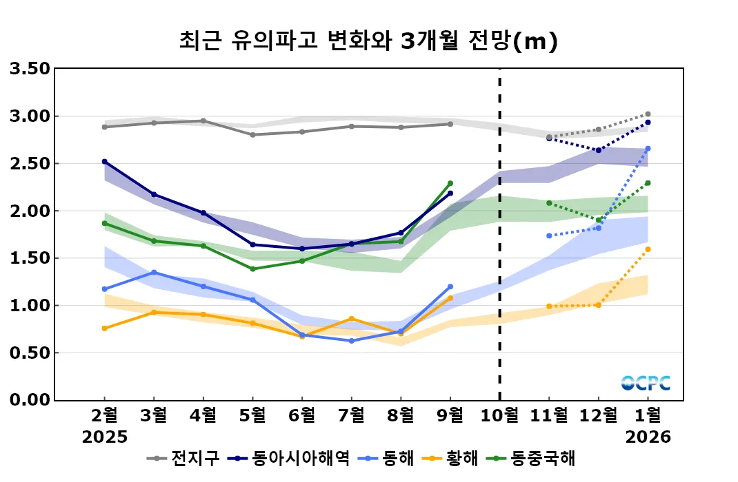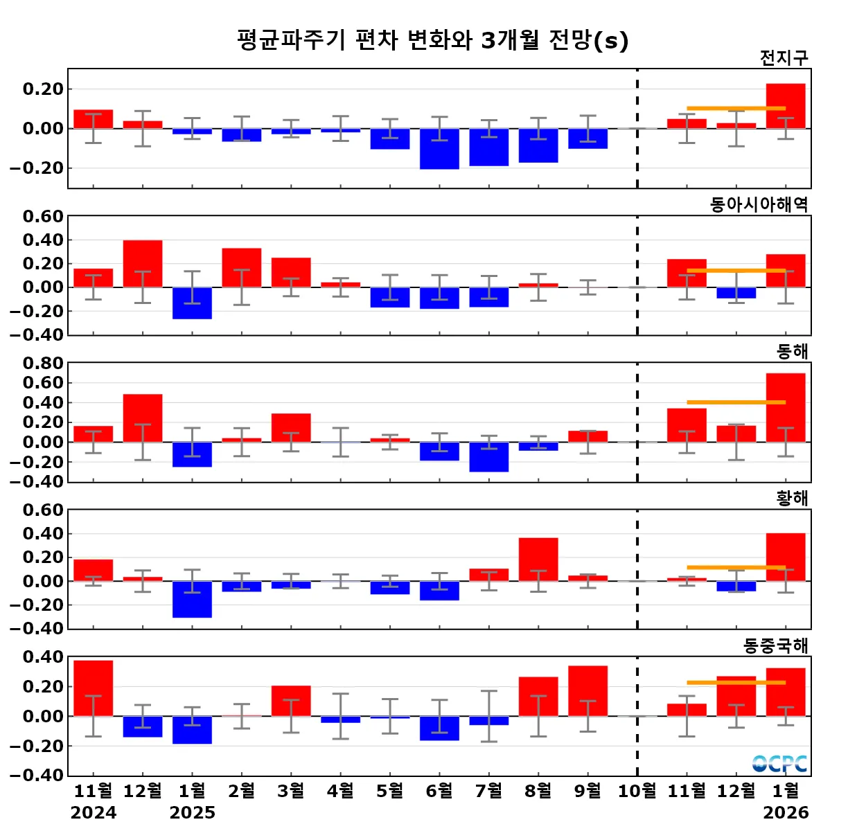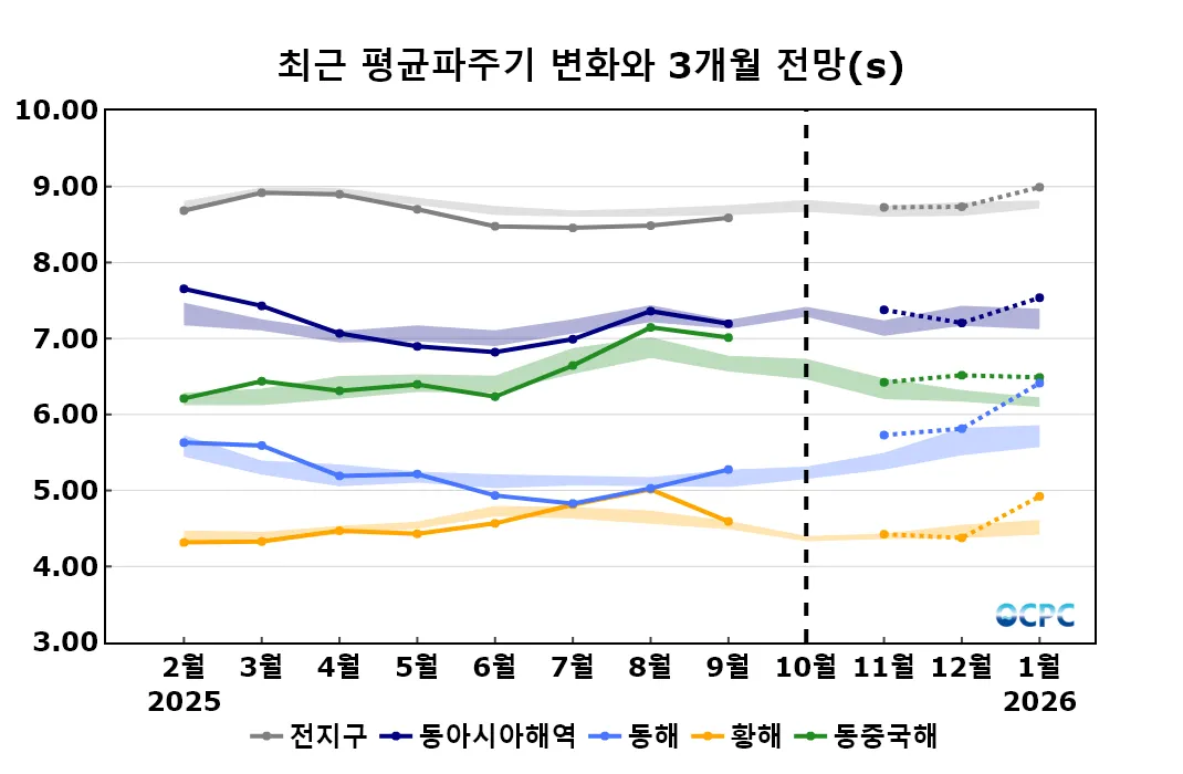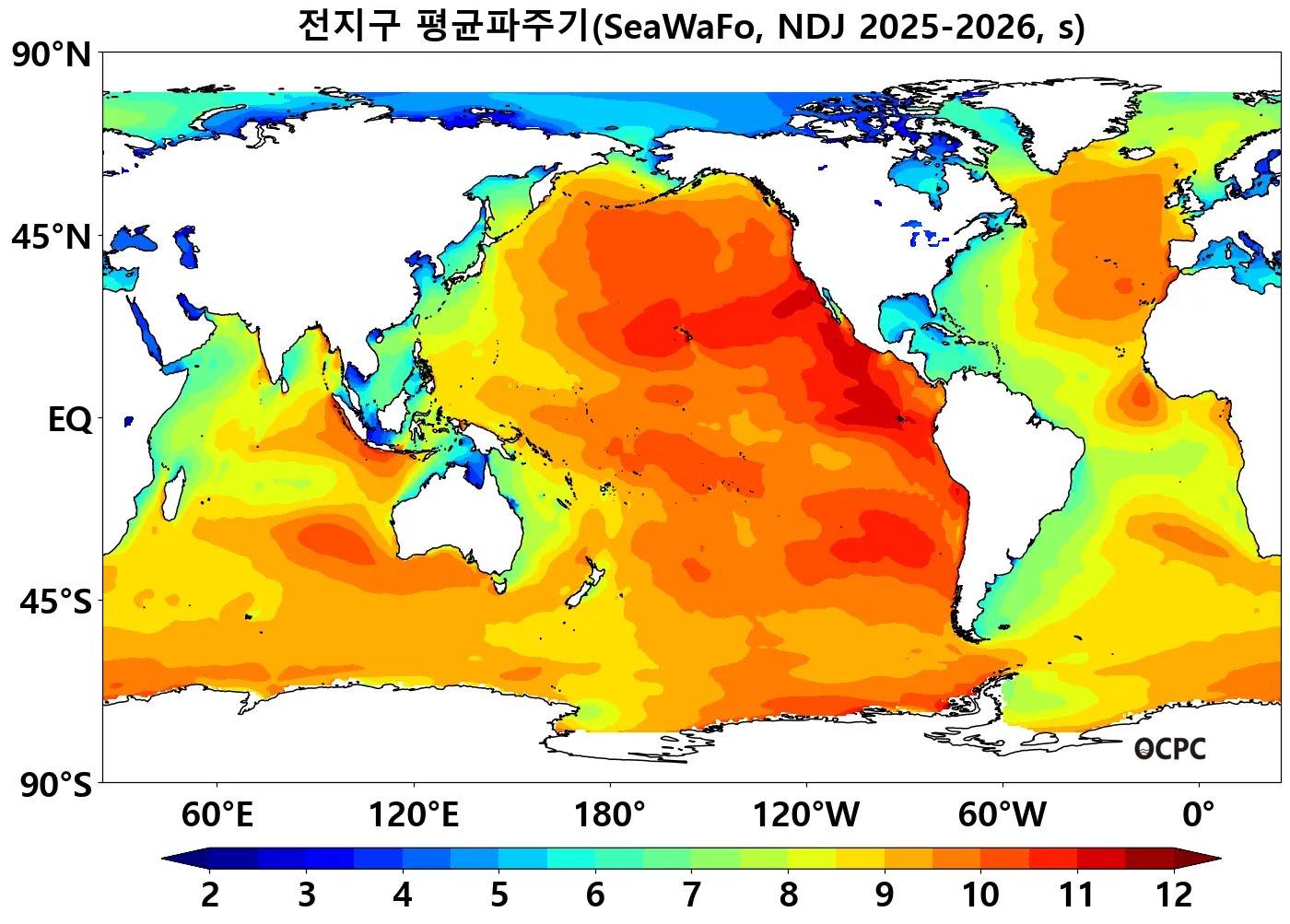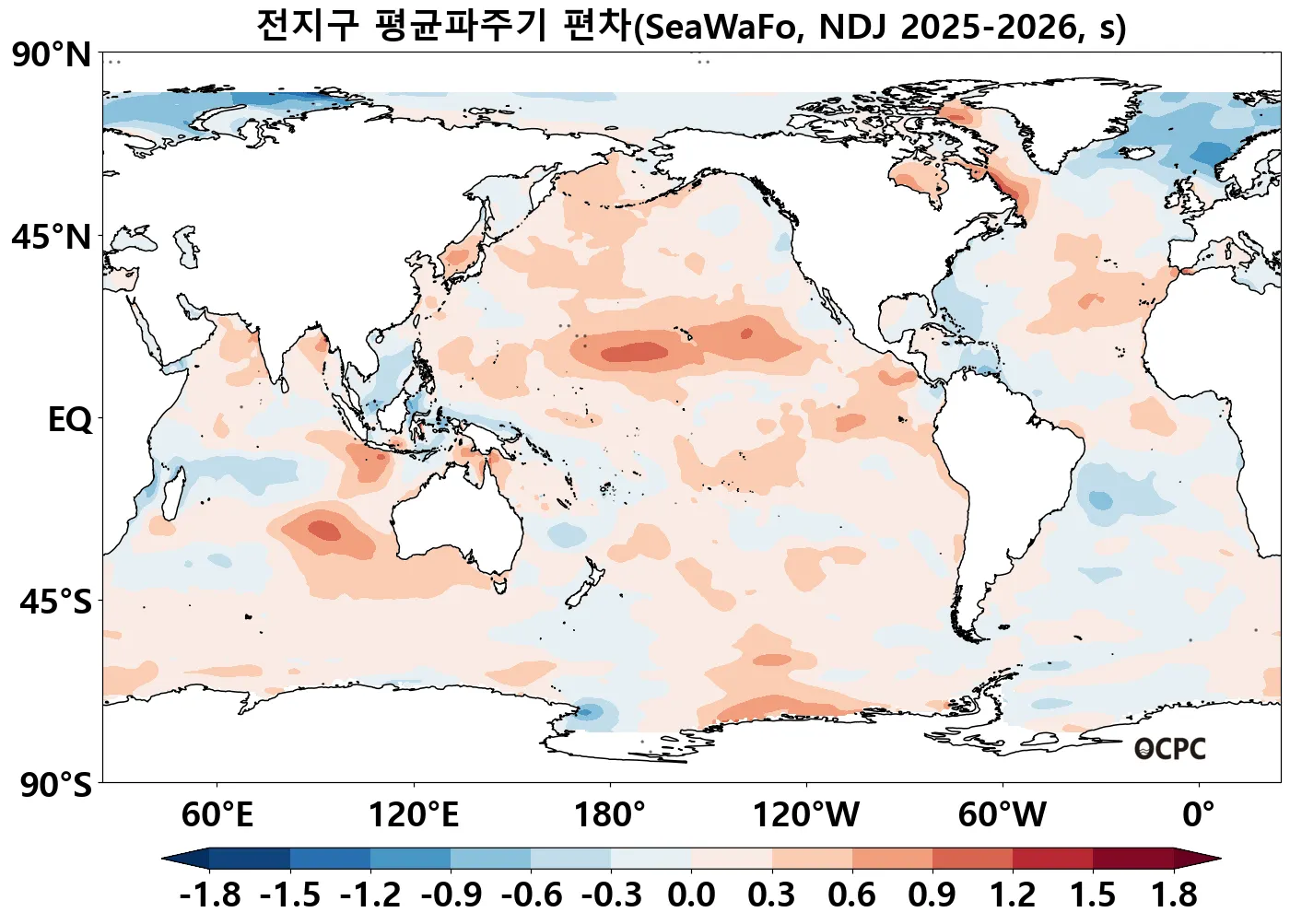 전지구 2025년 11월 ~ 2026년 1월 평균파주기는 평년(8.71±0.07초)보다 증가할 것으로 전망됩니다.