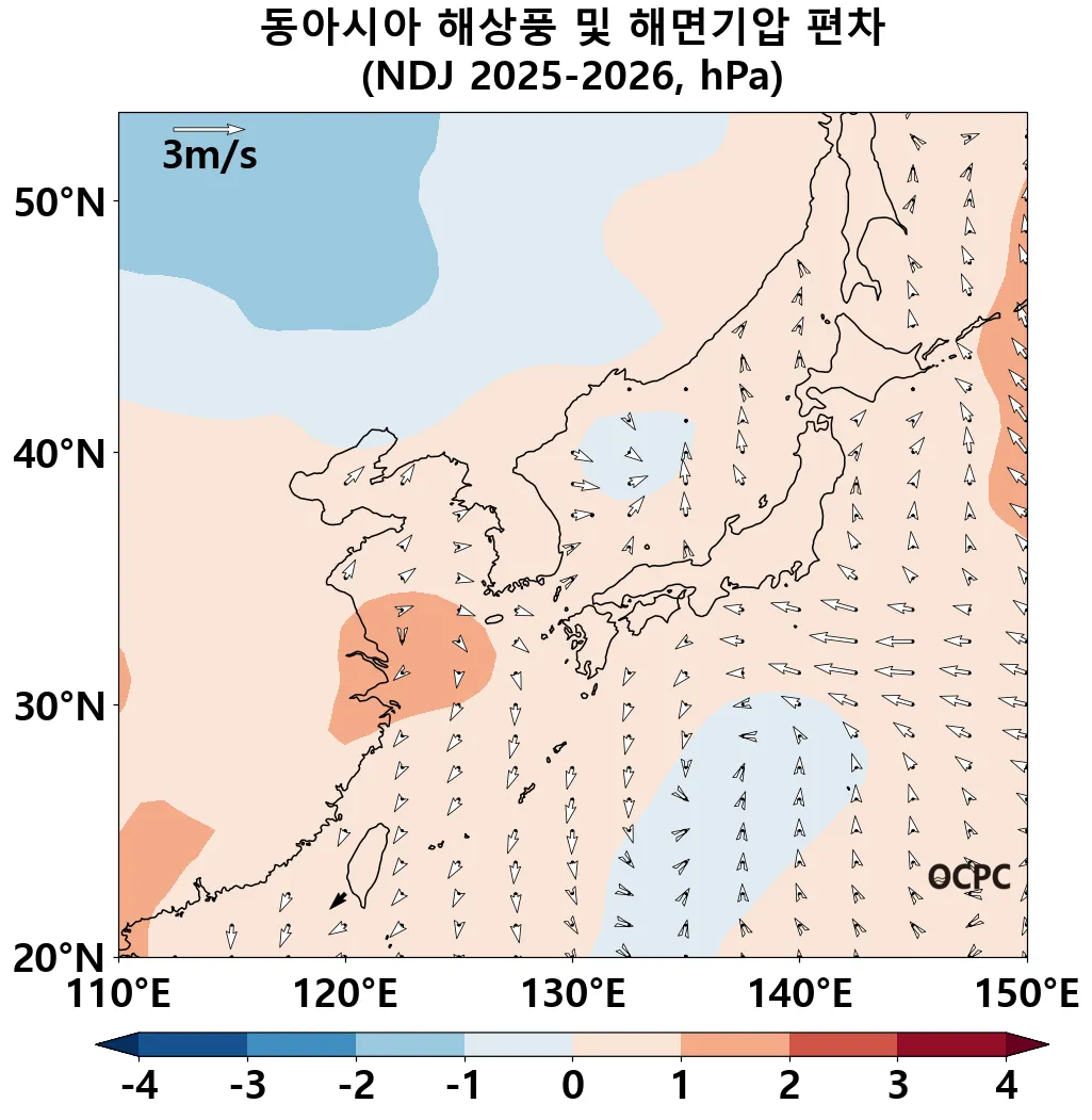 B. 동아시아 해상풍 및 해면기압 편차 전망(2025년 11월~2026년 1월 평균, 흑색벡터: 평년 ±2 표준편차 초과해역)