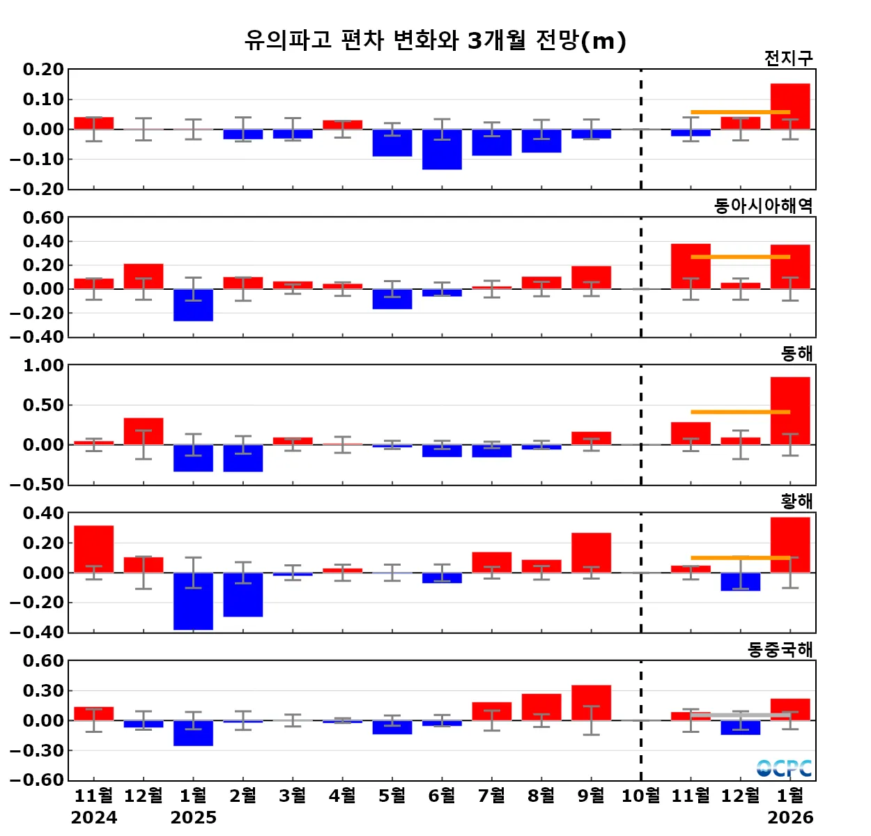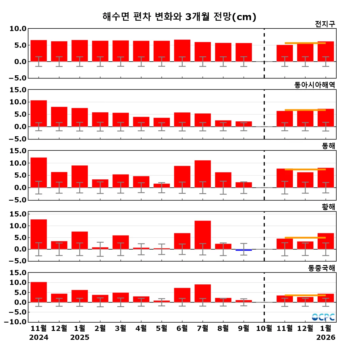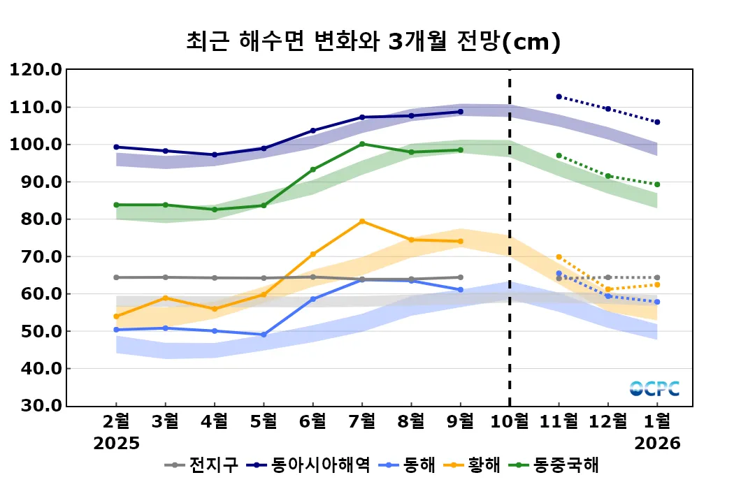 동해, 황해, 동중국해의 2025년 11월 ~ 2026년 1월 평균 해수면은 평년(54±2cm, 60±2cm, 89±2cm)보다 높겠으며, 2025년 12월에는 편차가 감소하다가 2026년 1월에는 다시 상승할 것으로 보입니다.