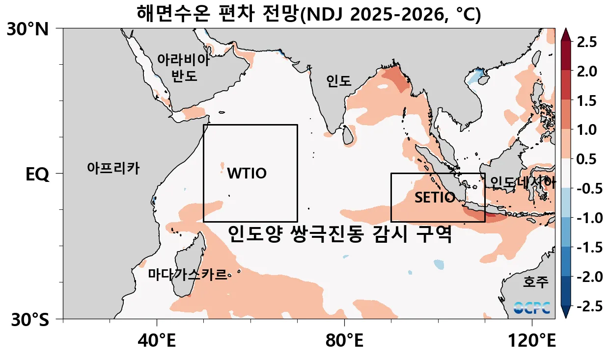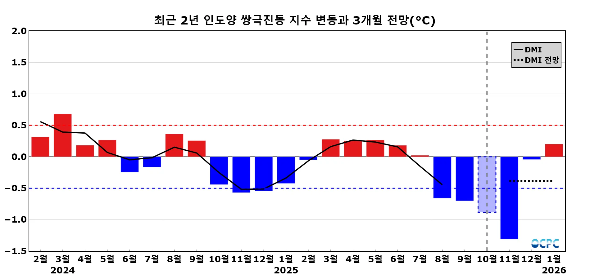 2025년 11월까지 열대 남동인도양 해역의 높은 해면수온 편차로 인해 음의 상태를 유지하지만 2026년 1월로 갈수록 열대 서인도양 해면수온 편차는 상승하고 남동인도양 해면수온 편차는 감소함에 따라 인도양 쌍극진동 지수는 상승할 것으로 전망됩니다.