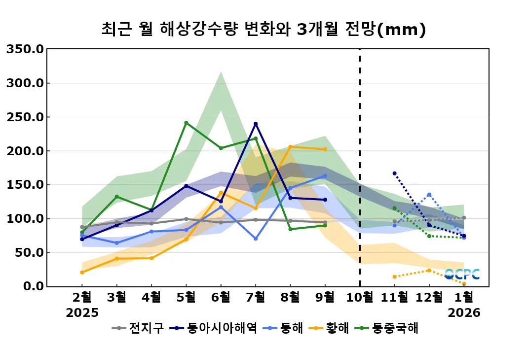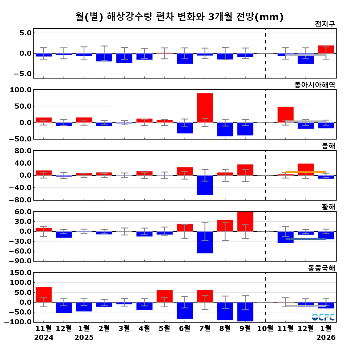 동해의 2025년 11월 ~ 2026년 1월 평균 해상강수량은 평년(88.8±9.2mm)보다 많겠으며, 황해의 2025년 11월 ~ 2026년 1월 평균 해상강수량은 평년(36.9±10.6mm)보다 적겠습니다. 동중국해의 2025년 11월 ~ 2026년 1월 평균 해상강수량은 평년(105.1±20.5mm)과 비슷하겠습니다.