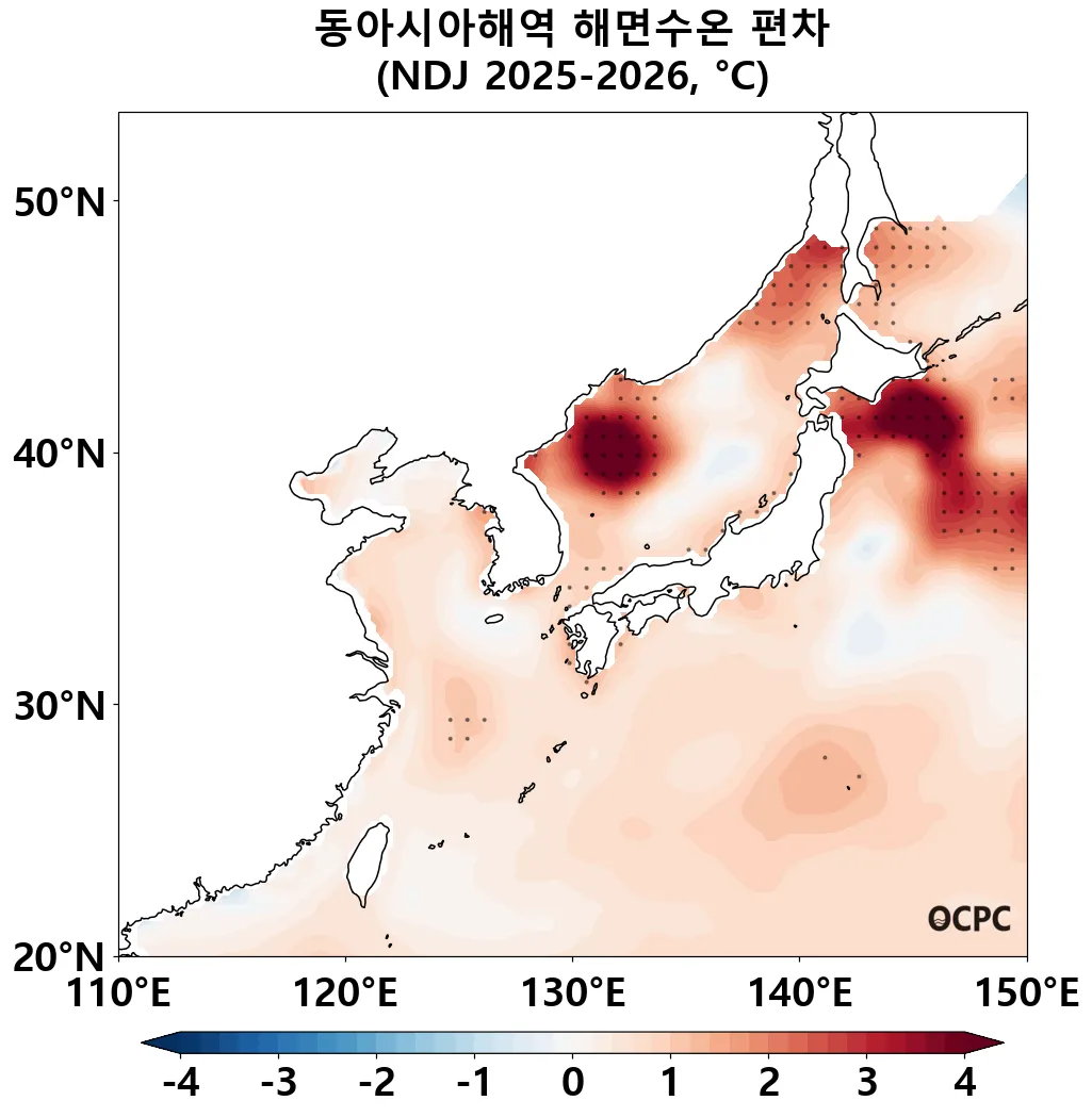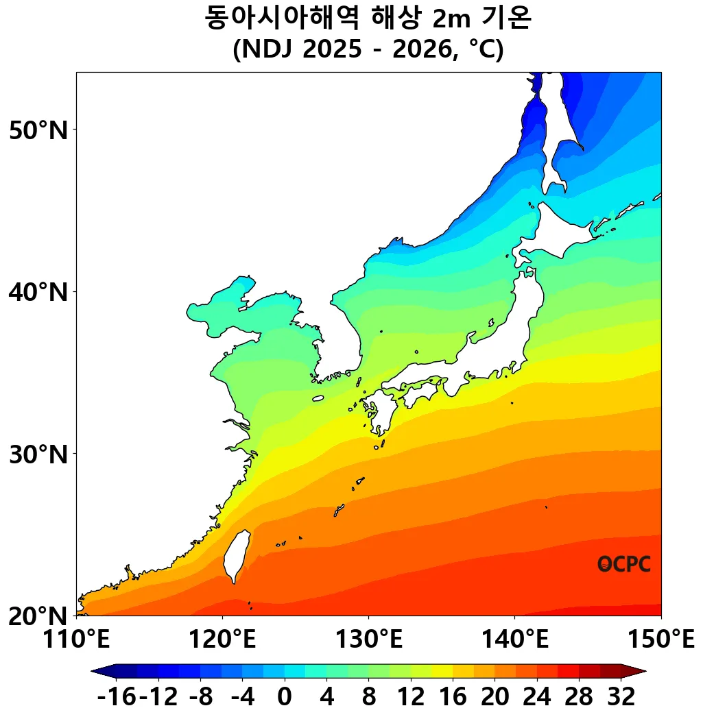 동해, 황해의 2025년 11월 ~ 2026년 1월 평균 해상기온은 평년(3.0±0.5℃, 6.2±0.5℃)보다 높겠습니다. 특히 동해 해상 일부에서는 평년 2표준 편차를 초과하는 높은 해상기온이 나타나겠습니다. 동중국해의 2025년 11월 ~ 2026년 1월 평균 해상기온은 평년(15.4±0.5℃) 평년과 비슷하겠습니다.