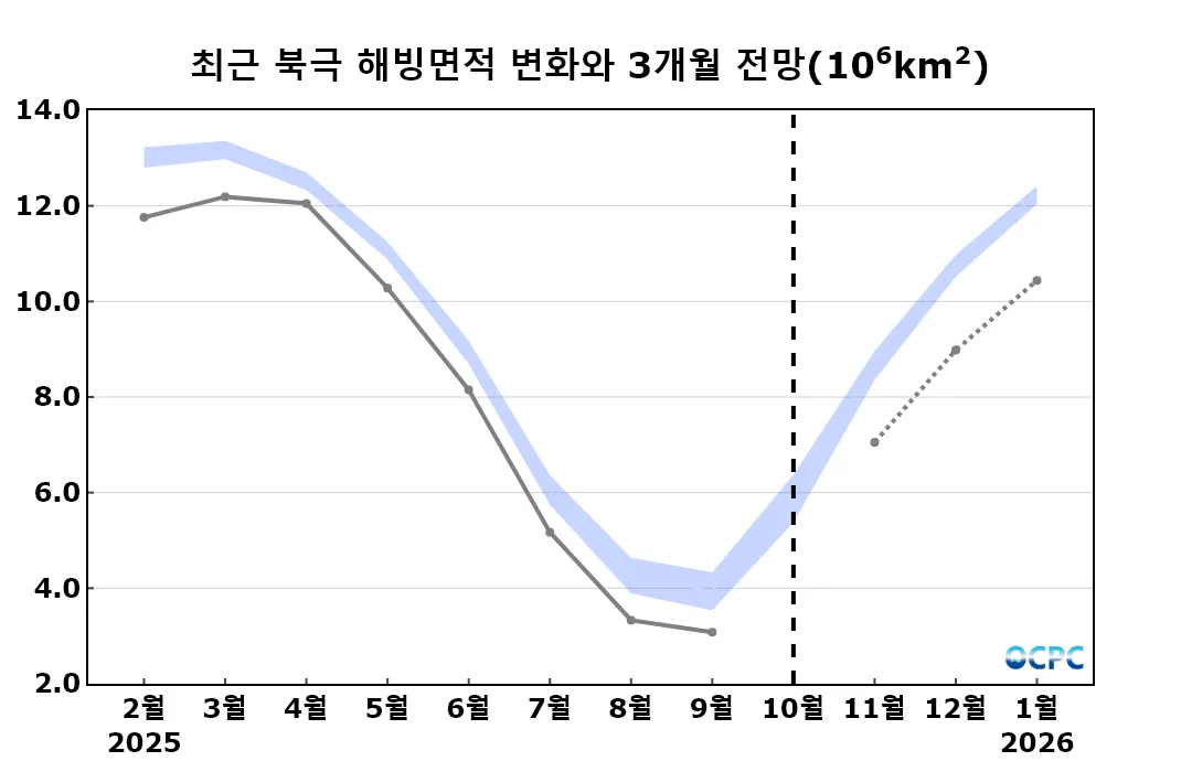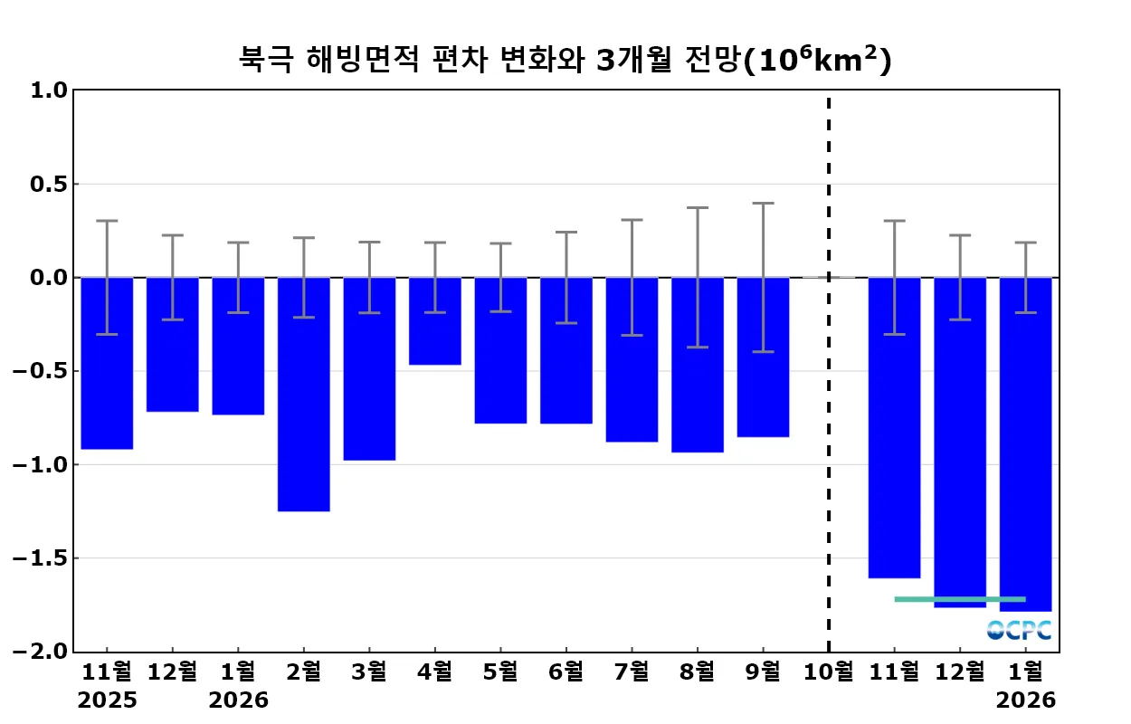 북극 2025년 11월 ~ 2026년 1월 평균 해빙면적은 평년(1,055만±24만km²)보다 감소할 것으로 전망되며, 11월에서 1월로 갈수록 음의 편차는 증가할 것으로 전망됩니다.