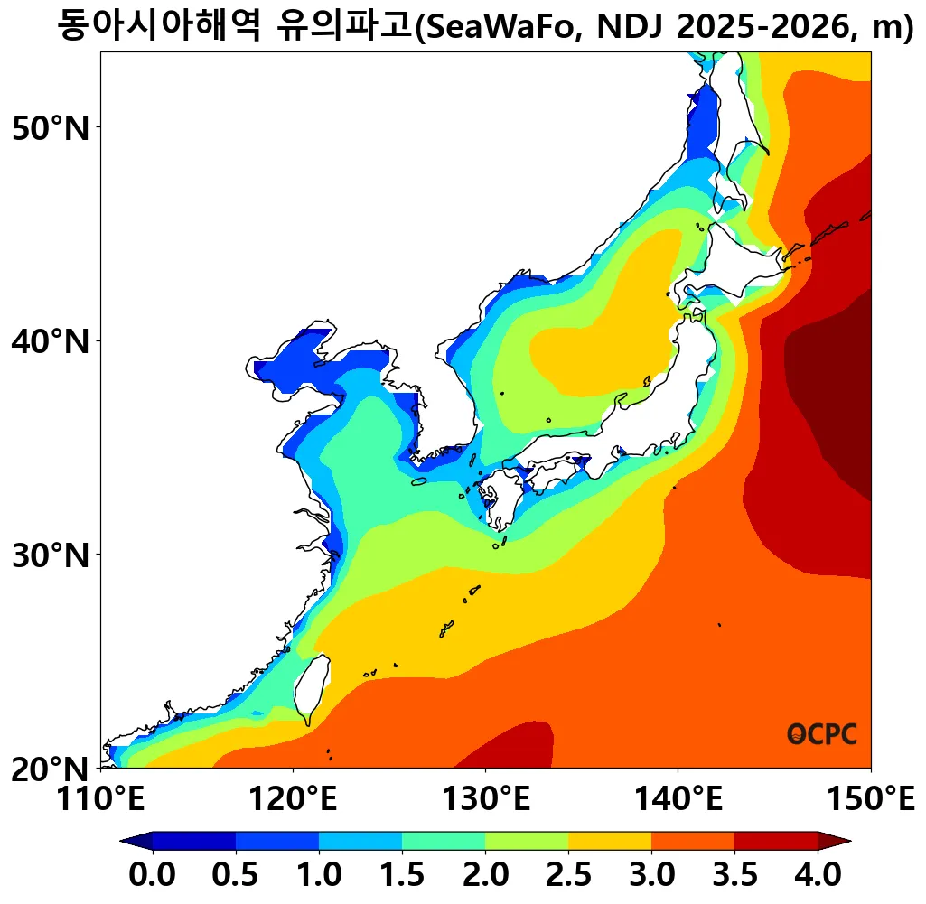 동아시아해역의 2025년 11월 ~ 2026년 1월 평균 유의파고는 평년(2.51±0.09m)보다 증가할 것으로 전망됩니다. 동아시아 중위도(20~35°N) 해역, 그리고 동해에서 강한 해상풍속이 지속되어 유의파고의 발달을 유도할 것으로 예상됩니다.