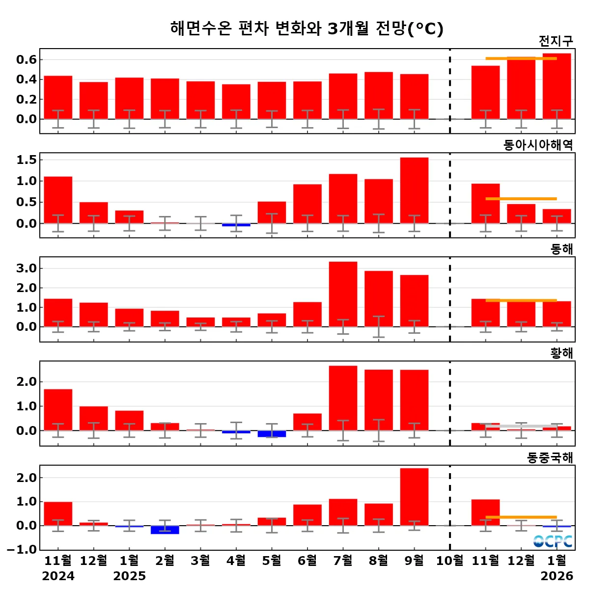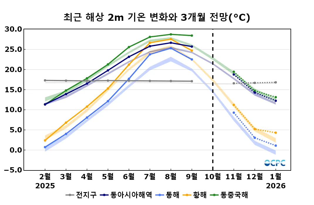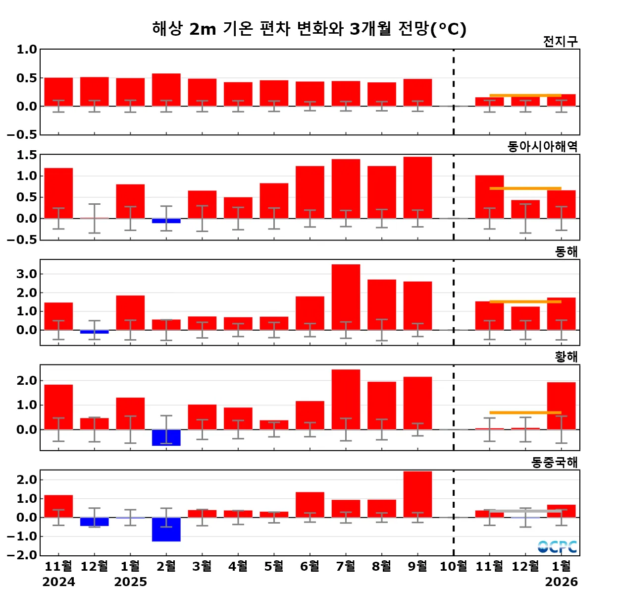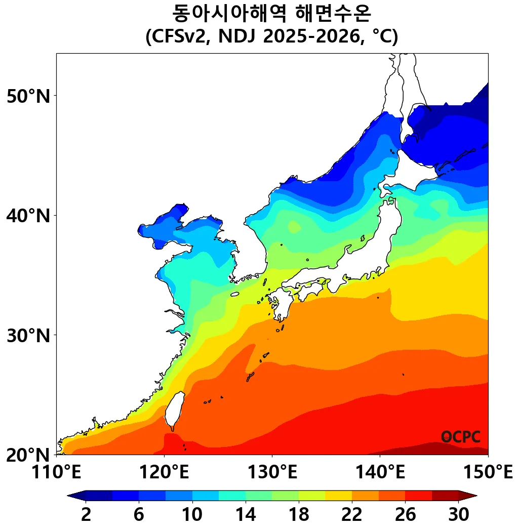 동해와 동중국해 2025년 11월 ~ 2026년 1월 평균 해면수온은 평년(10.2±0.2℃, 20.5±0.2℃)보다 각각 1.4℃, 0.4℃ 높겠으며, 황해 2025년 11월 ~ 2026년 1월 평균 해면수온은 평년(11.4±0.3℃)과 비슷하겠습니다.