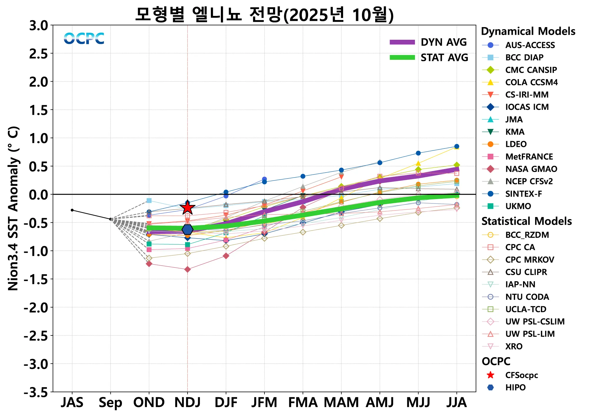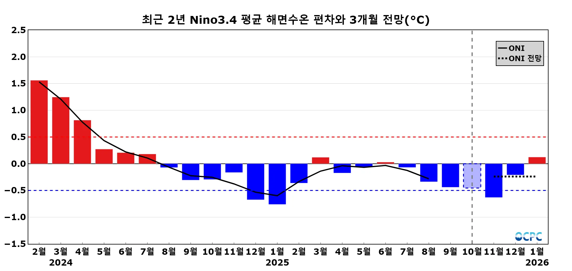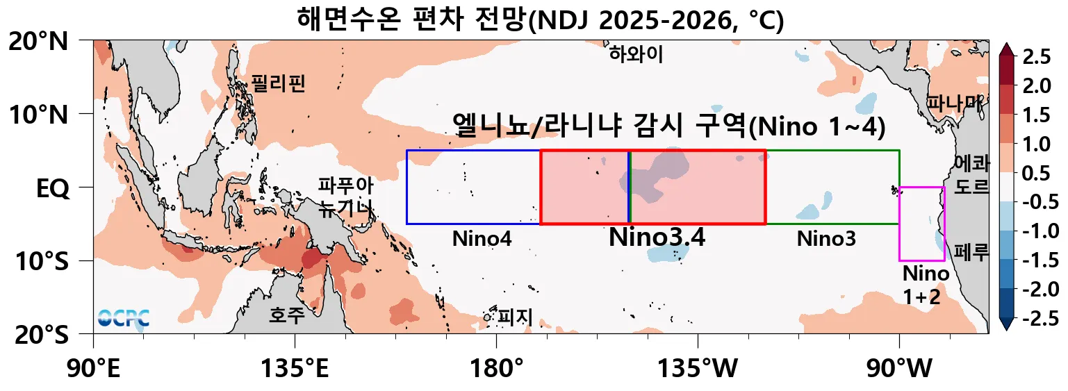 엘니뇨/라니냐 감시구역인 Nino3.4 해역(5°S~5°N, 170°W~120°W)의 10월 1~20일 평균 해면수온 편차는 -0.45℃로 중립 상태이며, 2025년 11월 ~ 2026년 1월 (NDJ) 평균 해면수온 편차는 -0.2℃ 로 중립 상태를 전망합니다.