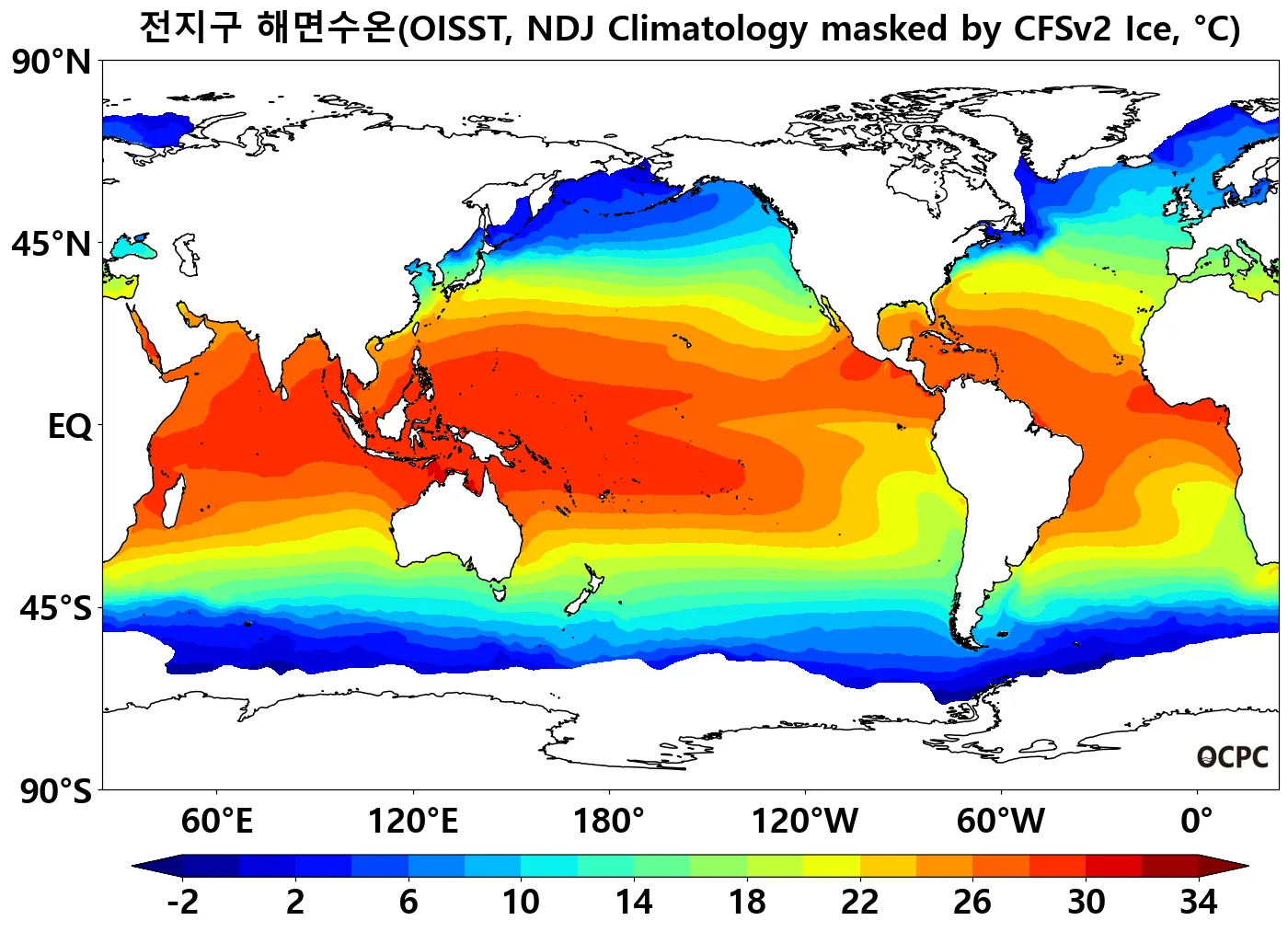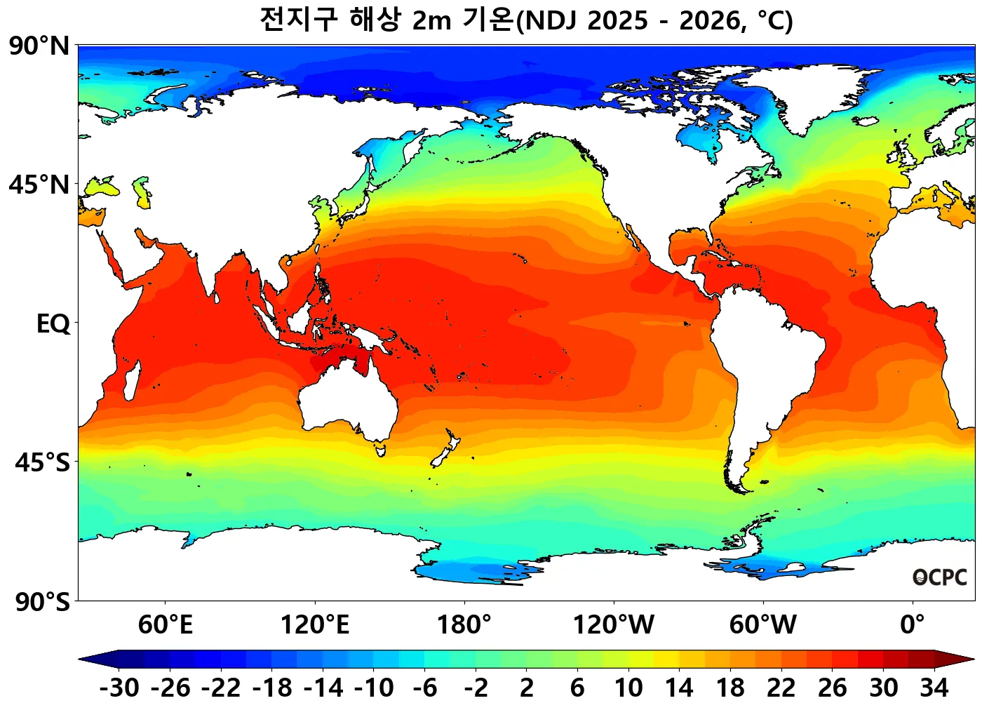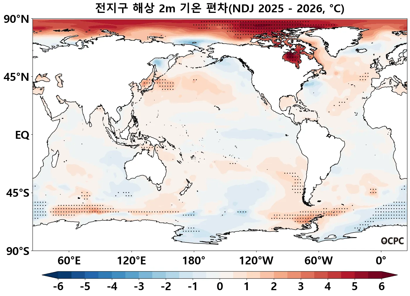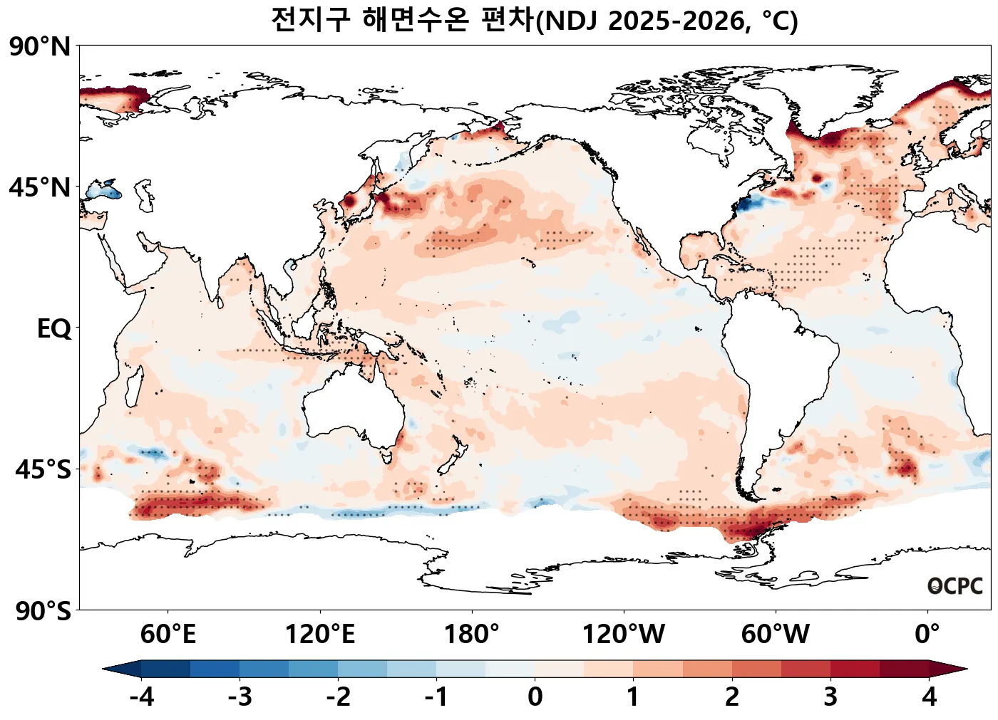전지구 2025년 11월 ~ 2026년 1월 평균 해면수온은 평년(18.1±0.1℃)보다 0.6℃ 높겠으며, 쿠로시오 확장역을 포함한 중위도 북태평양, 열대 서태평양, 북극해(바렌츠-카라해) 그리고 남극해 일부 해역(벨링스하우젠해 및 동남극해)에서 평년 2 표준편차를 초과하는 높은 해면수온 편차가 예상됩니다. 반면, 열대 중태평양과 남극해 일부 해역(120~180°W, 50~60°S)에서 평년보다 낮은 해면수온 편차가 나타날 것으로 전망됩니다.