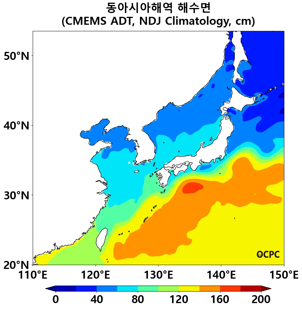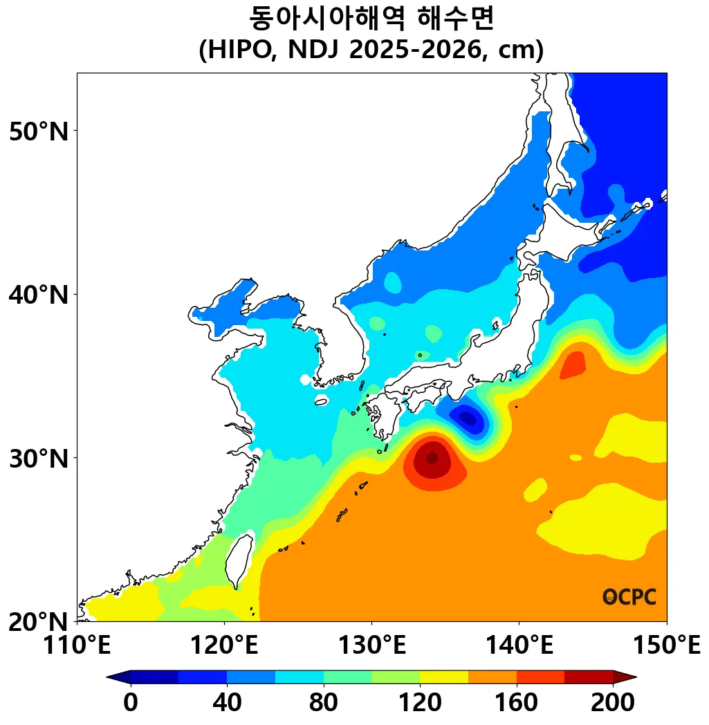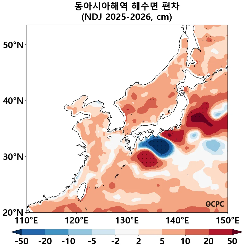 동아시아해역 2025년 11월 ~ 2026년 1월 평균 해수면은 평년(103±2cm)보다 높겠으며, 동아시아해역 내에서는 쿠로시오 확장역(140~150°E, 30~40°N)에서 가장 높은 편차를 보일 것으로 전망됩니다.