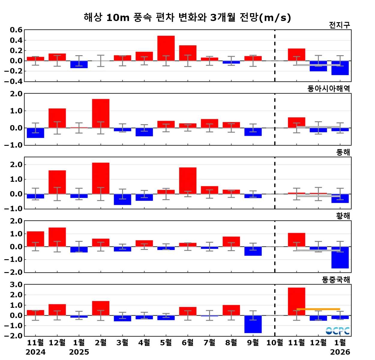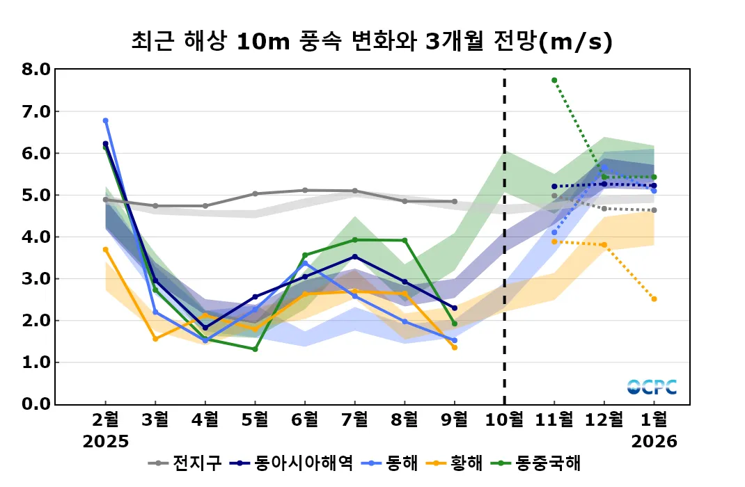 동해, 황해의 2025년 11월 ~ 2026년 1월 평균 해상풍속은 평년(5.1±0.4m/s, 3.7±0.4m/s)과 비슷하겠습니다. 동중국해의 2025년 11월 ~ 2026년 1월 평균 해상풍속은 평년(5.6±0.5m/s)보다 강하겠습니다.