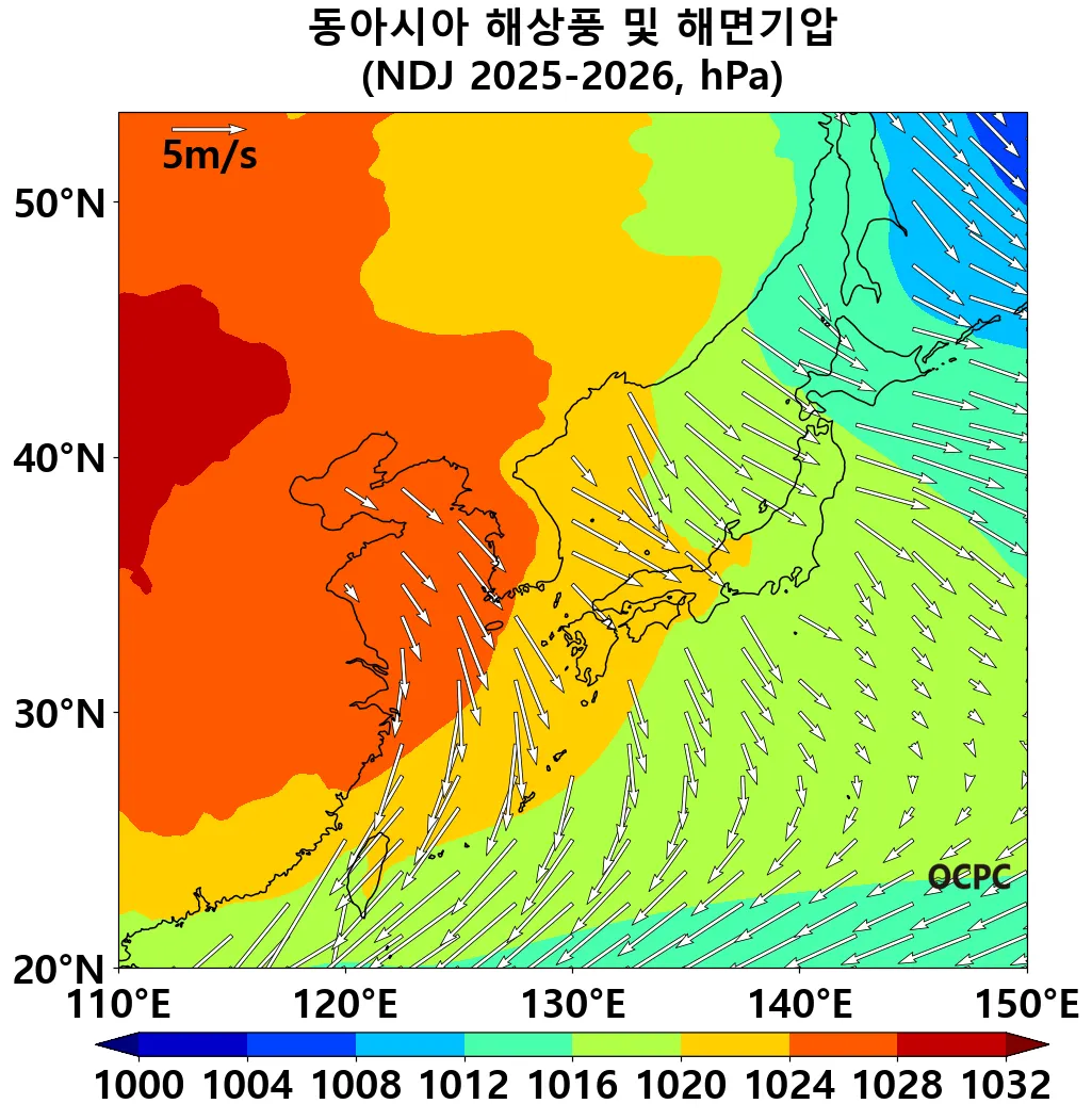 A+B. 동아시아 해상풍 및 해면기압 전망(2025년 11월~2026년 1월 평균)