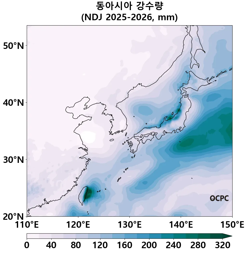 동아시아해역의 2025년 11월 ~ 2026년 1월 평균 해상강수량은 평년(106.6±8.0mm)과 비슷하겠습니다.