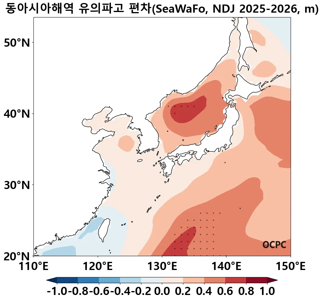 A-B. 동아시아해역 유의파고 편차 전망(2025년 11월~2026년 1월 평균, 점표시: 평년 ±2 표준편차 초과해역)