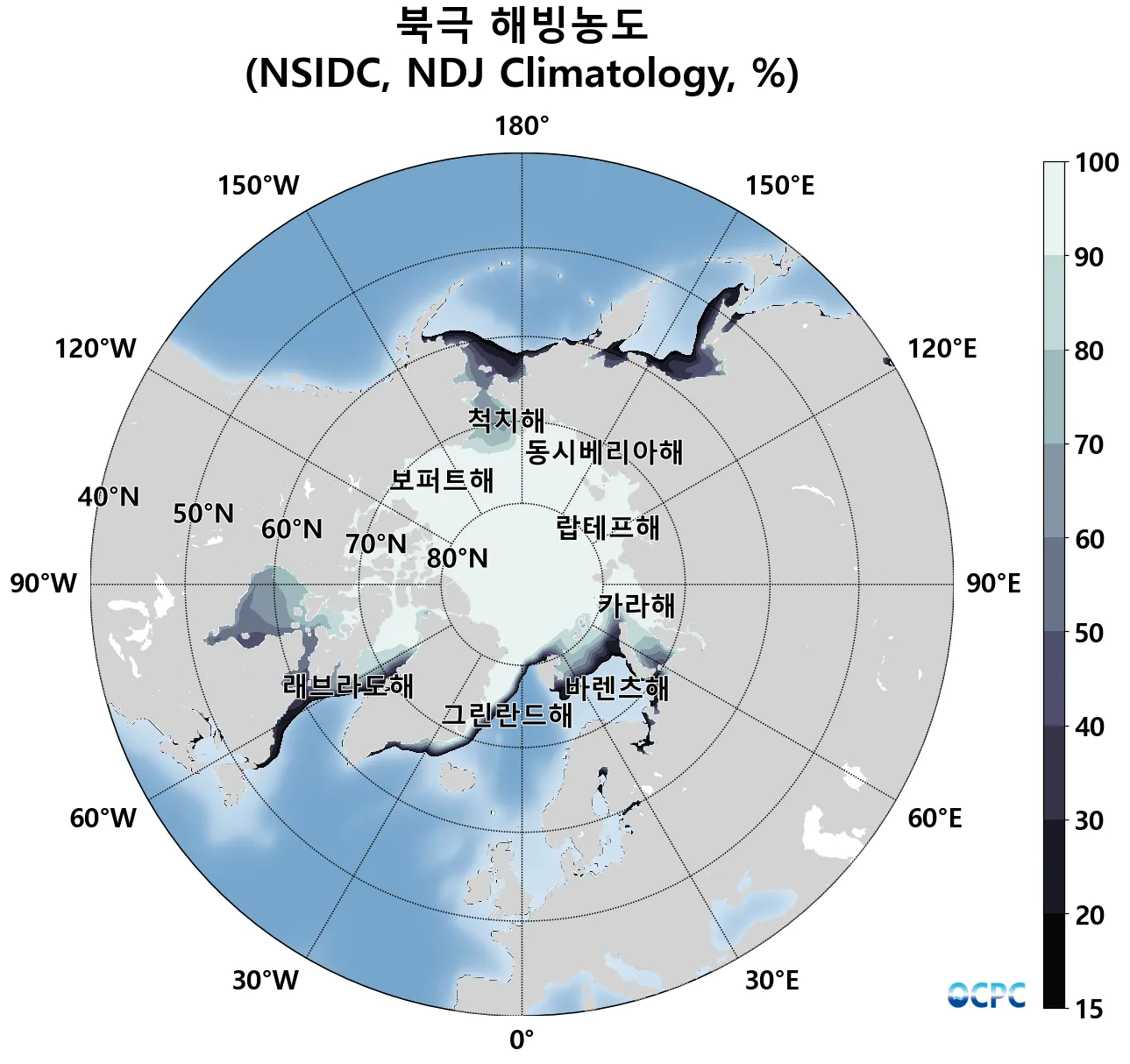 B. 북극 해빙농도(평년 11월~1월 평균, 15% 이상 해역)