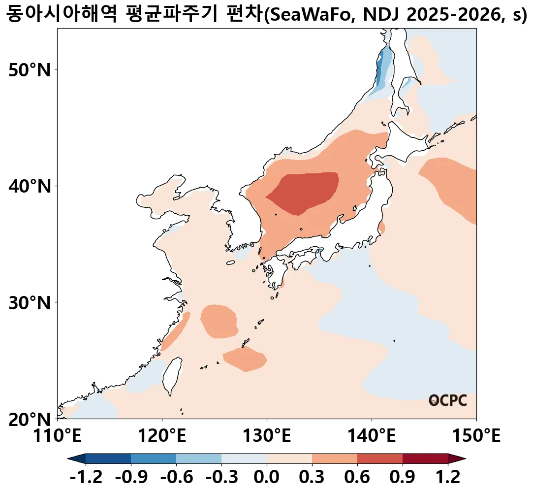동아시아해역의 2025년 11월 ~ 2026년 1월 평균파주기는 평년(7.23±0.12초)보다 증가할 것으로 전망됩니다. 이는 유의파고 증가와 마찬가지로, 평년보다 강해질 것으로 예측되는 해상풍에 의해 파랑이 발달한 결과로 추정됩니다.