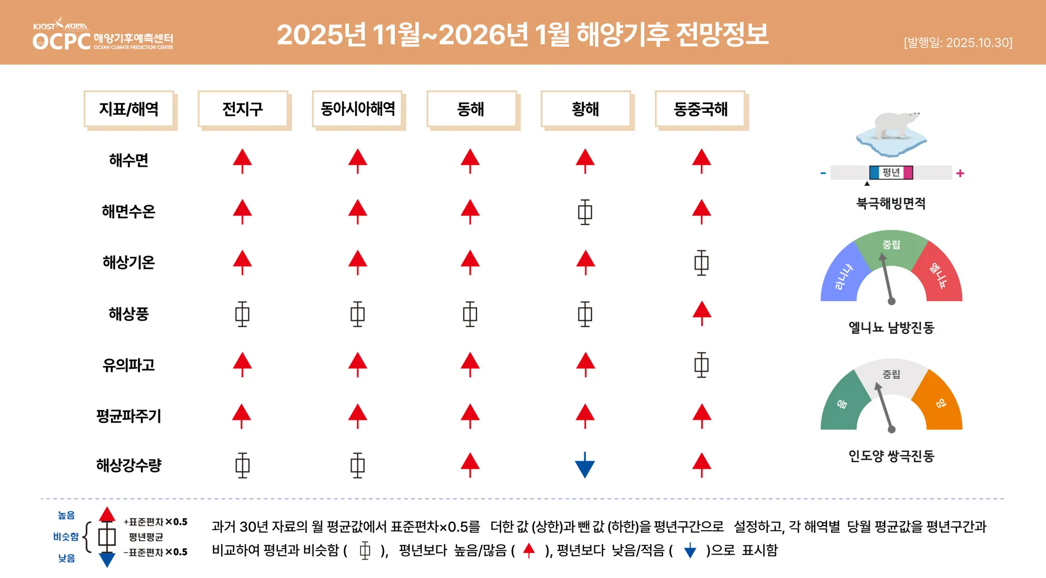 3개월(11, 12, 1월) 평균 전망: 해수면, 해면수온, 해상기온은 전지구, 동아시아해역에서 평년보다 높겠습니다. 북극 해빙 면적은 평년보다 작을 것으로 전망됩니다.