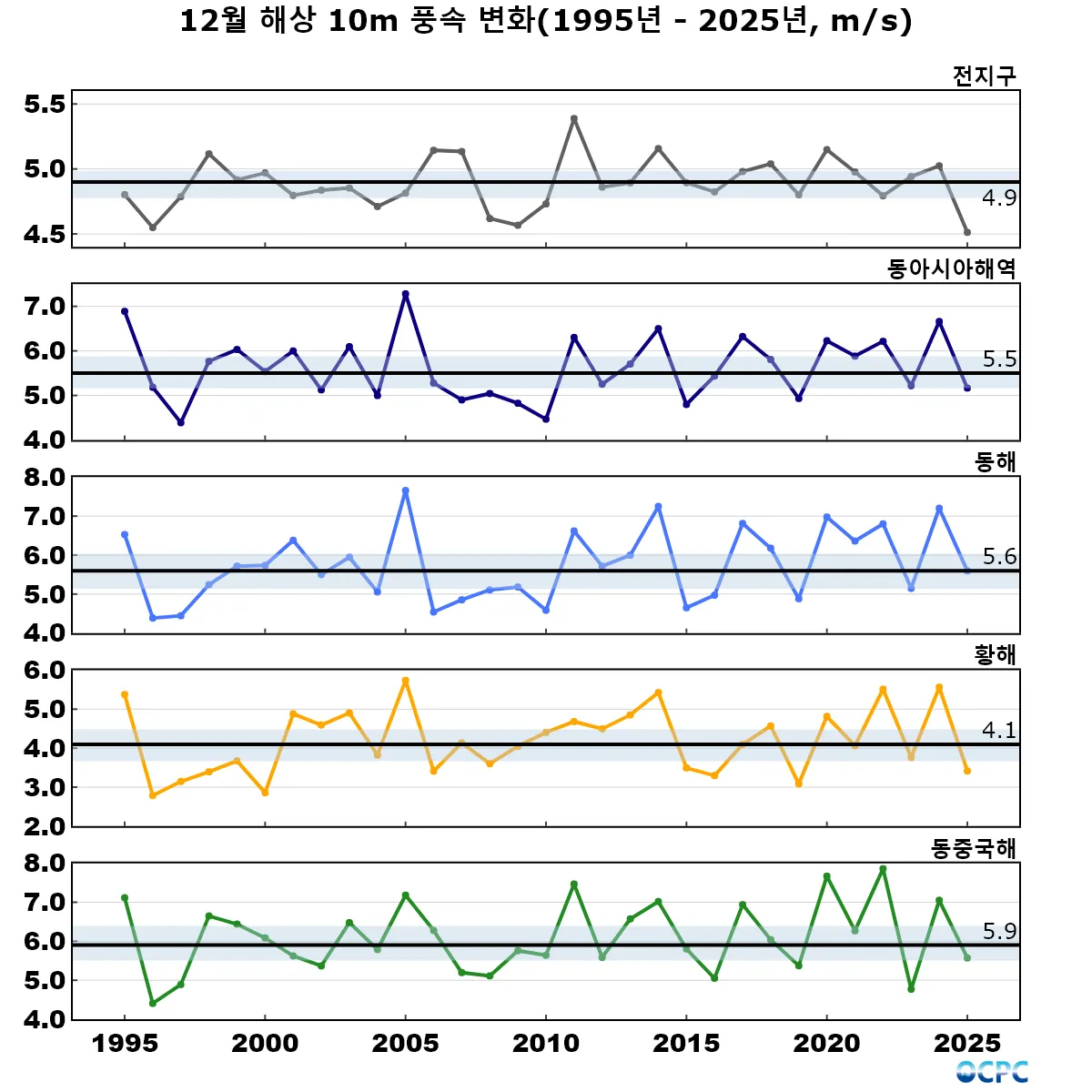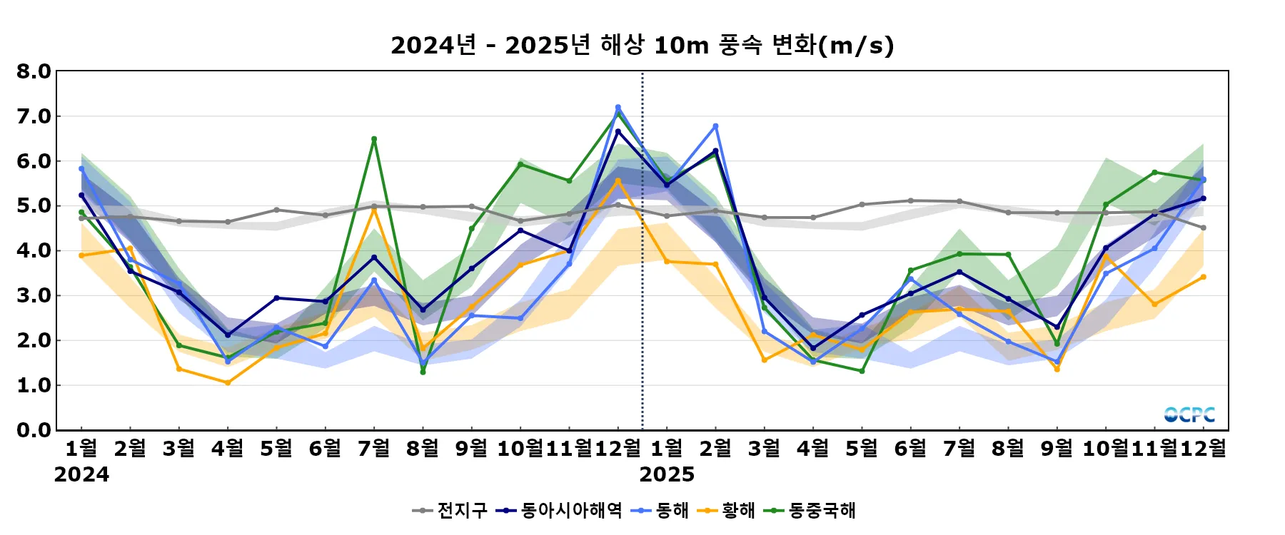 동아시아해역의 해상풍속은 평년(5.5±0.4 m/s)과 비슷했습니다.
