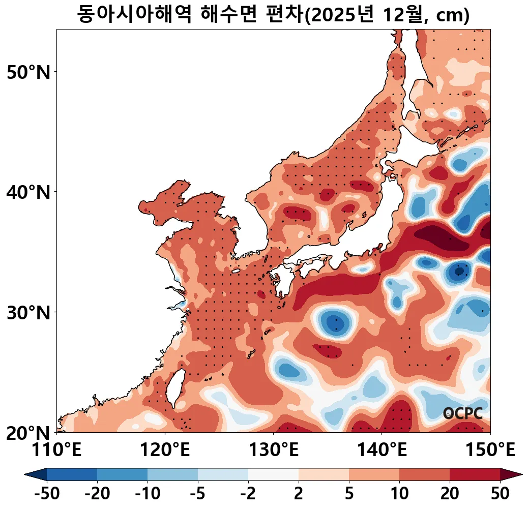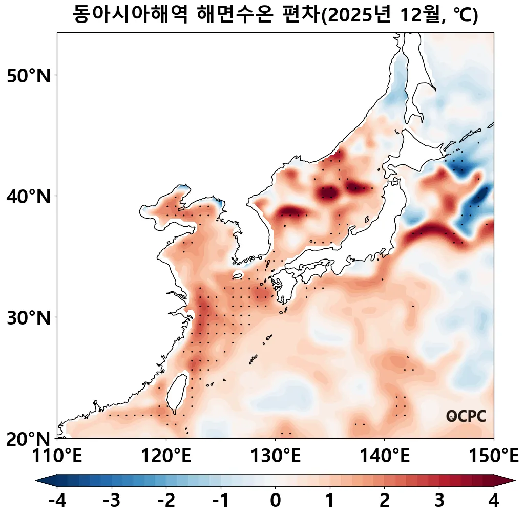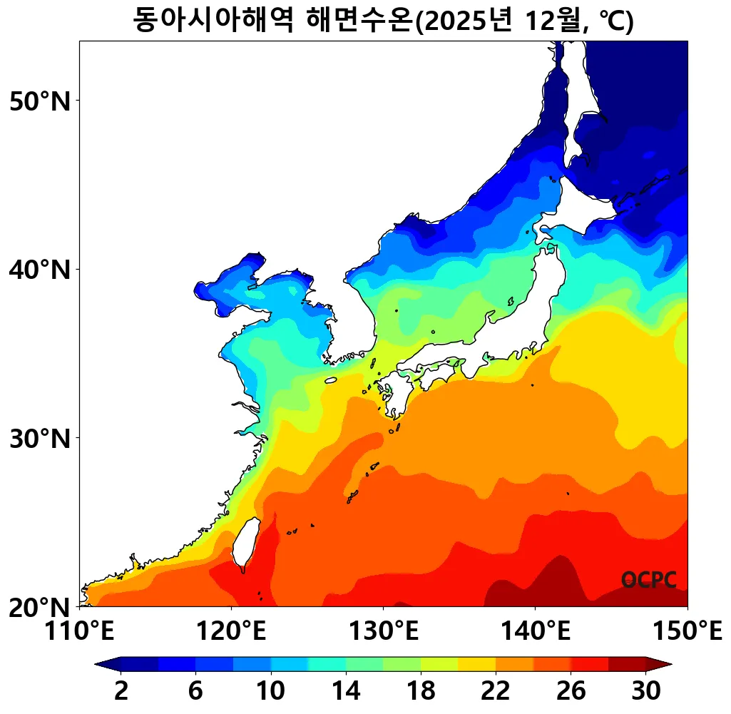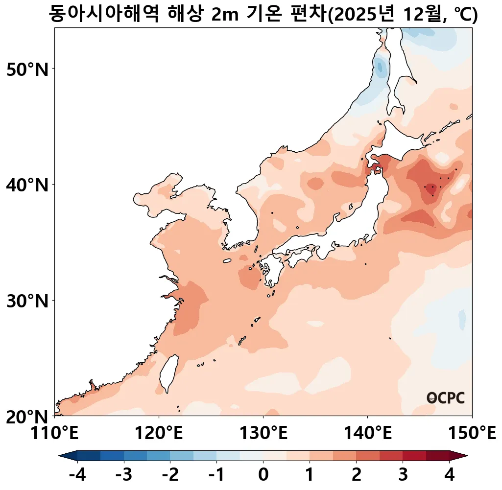 동해, 황해, 동중국해의 해상기온은 평년(1.8±0.5°C, 5.1±0.5°C, 14.8±0.5°C)보다 각각 0.8°C, 1.0°C, 1.3°C 높았습니다. 동중국해 해상 기온은 1995~2025년(12월) 중 세 번째로 높은 값입니다.