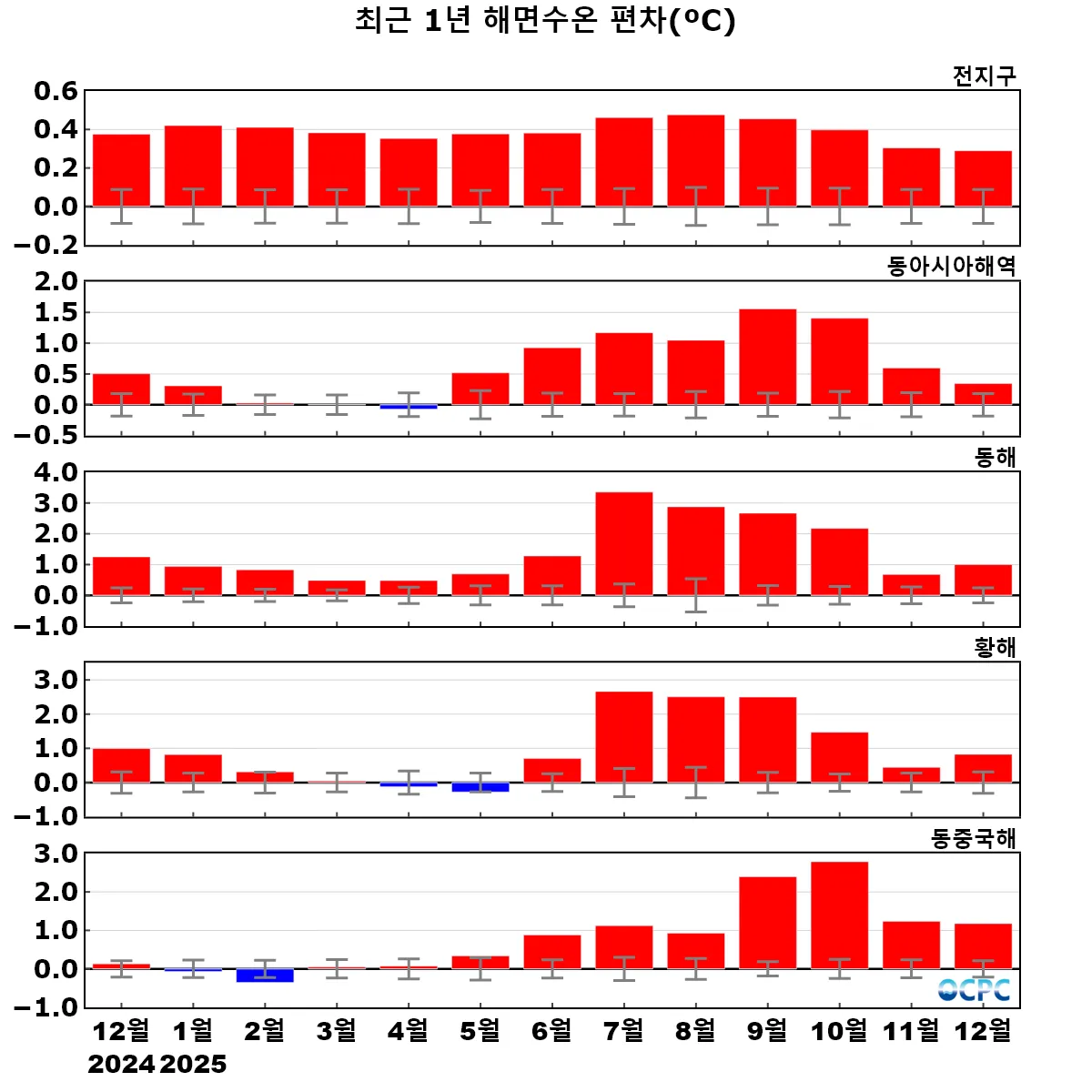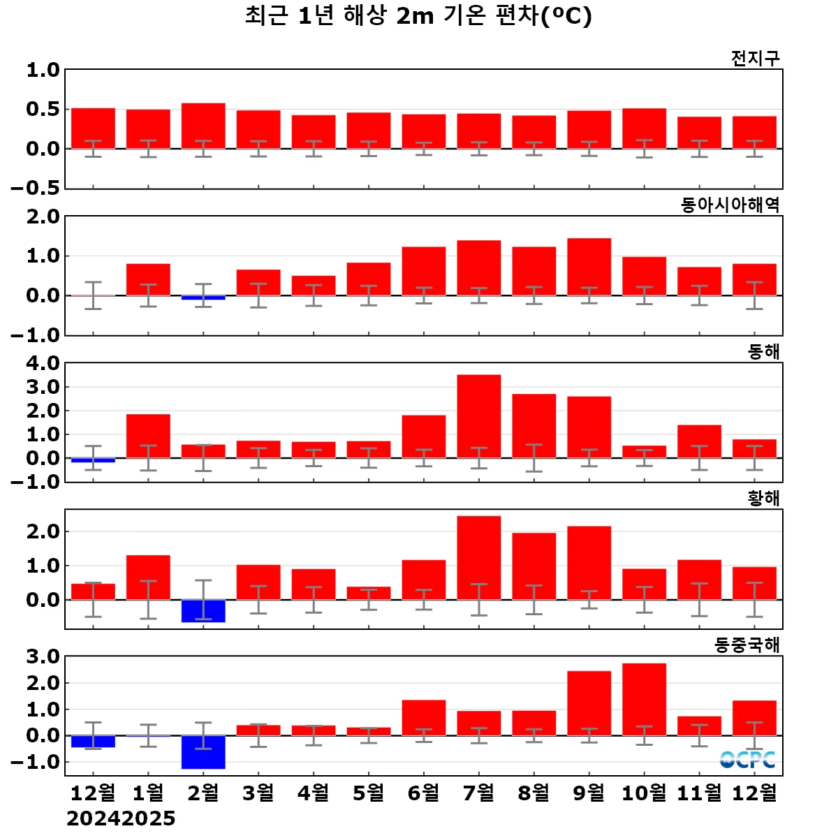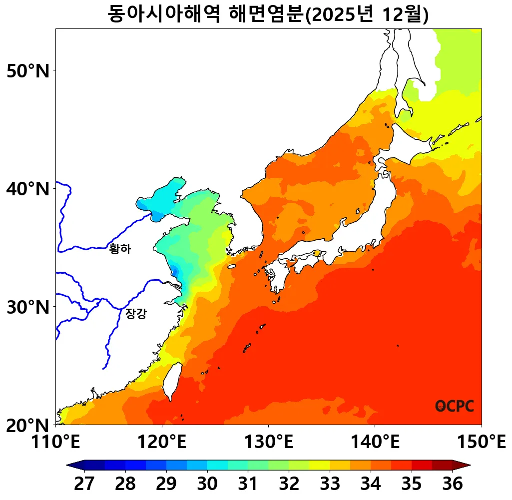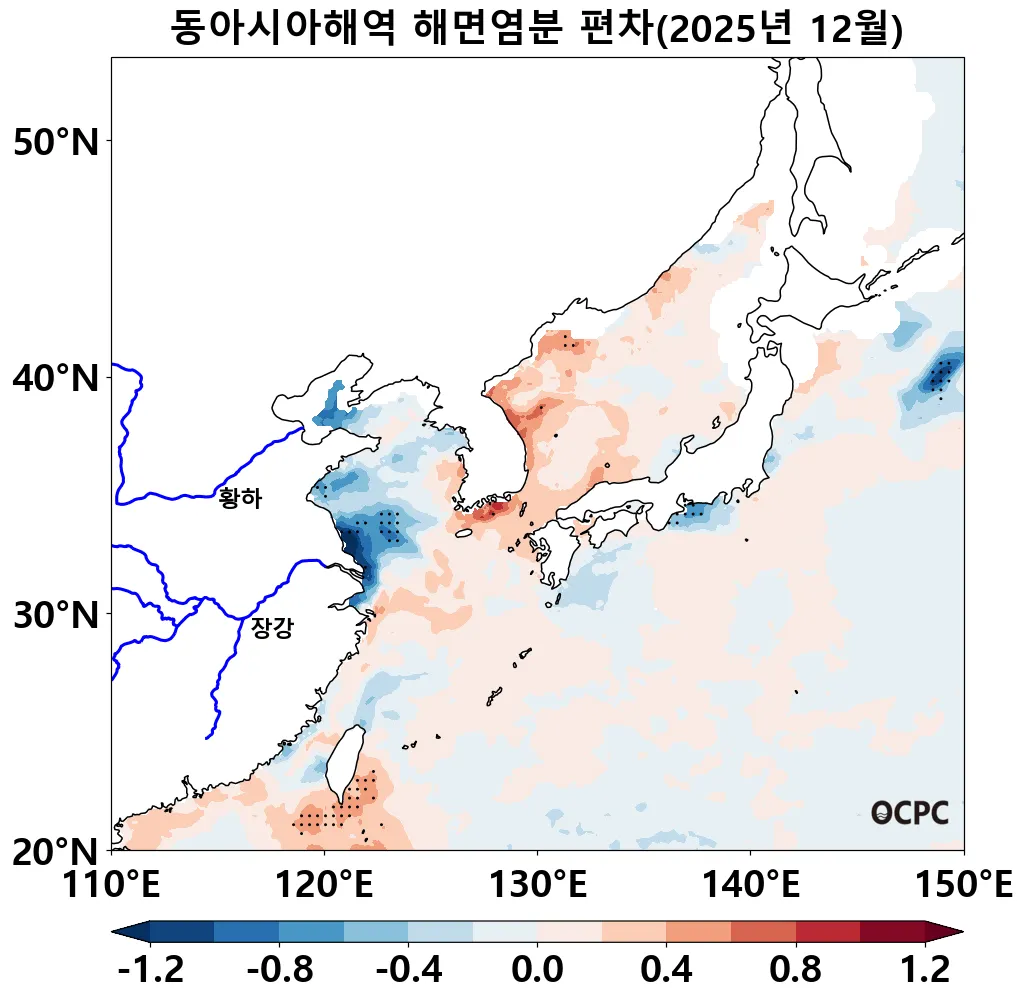 동해, 황해, 동중국해의 해상기온은 평년(1.8±0.5°C, 5.1±0.5°C, 14.8±0.5°C)보다 각각 0.8°C, 1.0°C, 1.3°C 높았습니다. 동중국해 해상 기온은 1995~2025년(12월) 중 세 번째로 높은 값입니다.