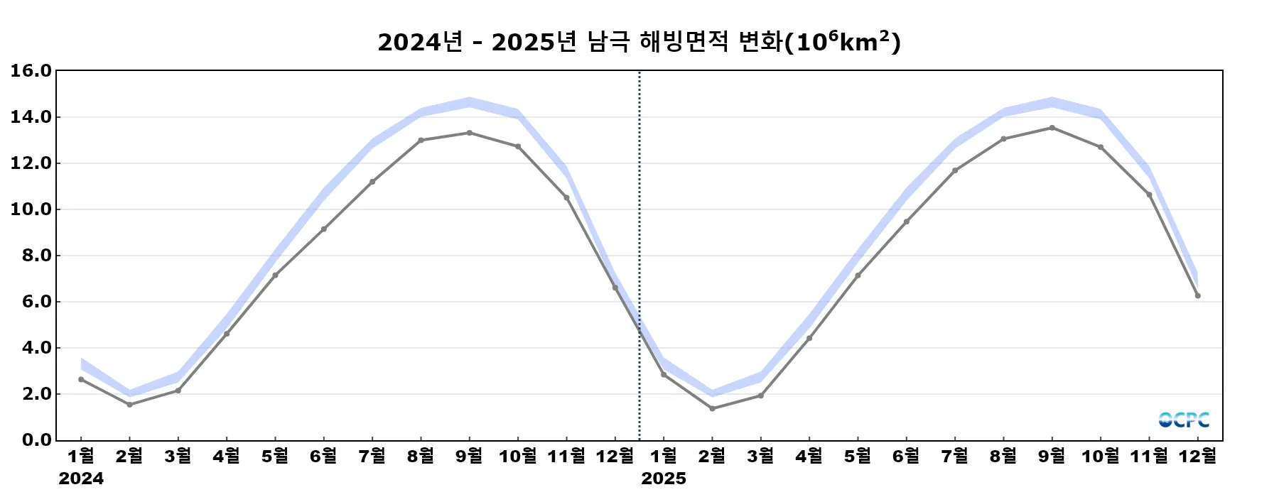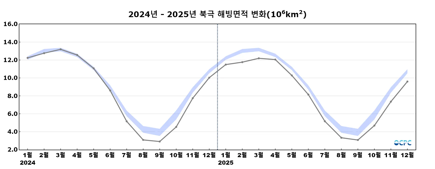 2024년 4월부터 OCPC 보고서의 해빙면적은 유효면적계산법(Sea Ice Area)로 산출되었습니다. 참고