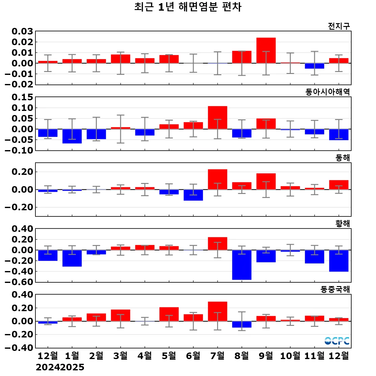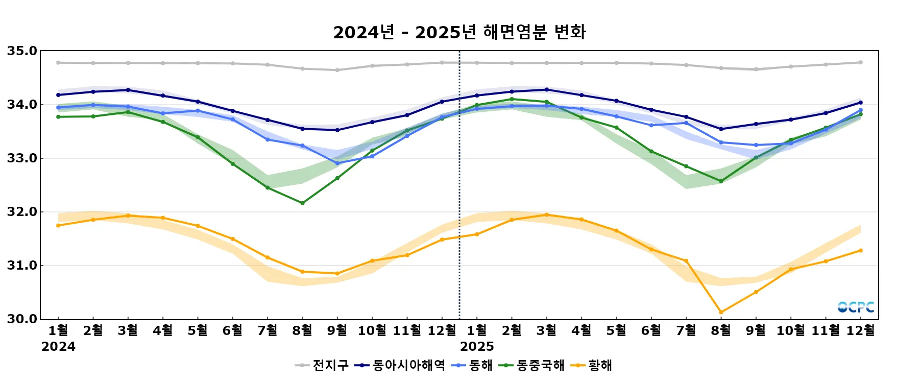 (2024.01) Delayed Mode 자료 사용 및 해역 평균 계산 방식 변경 (2025.01) 공간해상도 변경(1/4도 → 1/8도) 자료로 평년 새로 산출