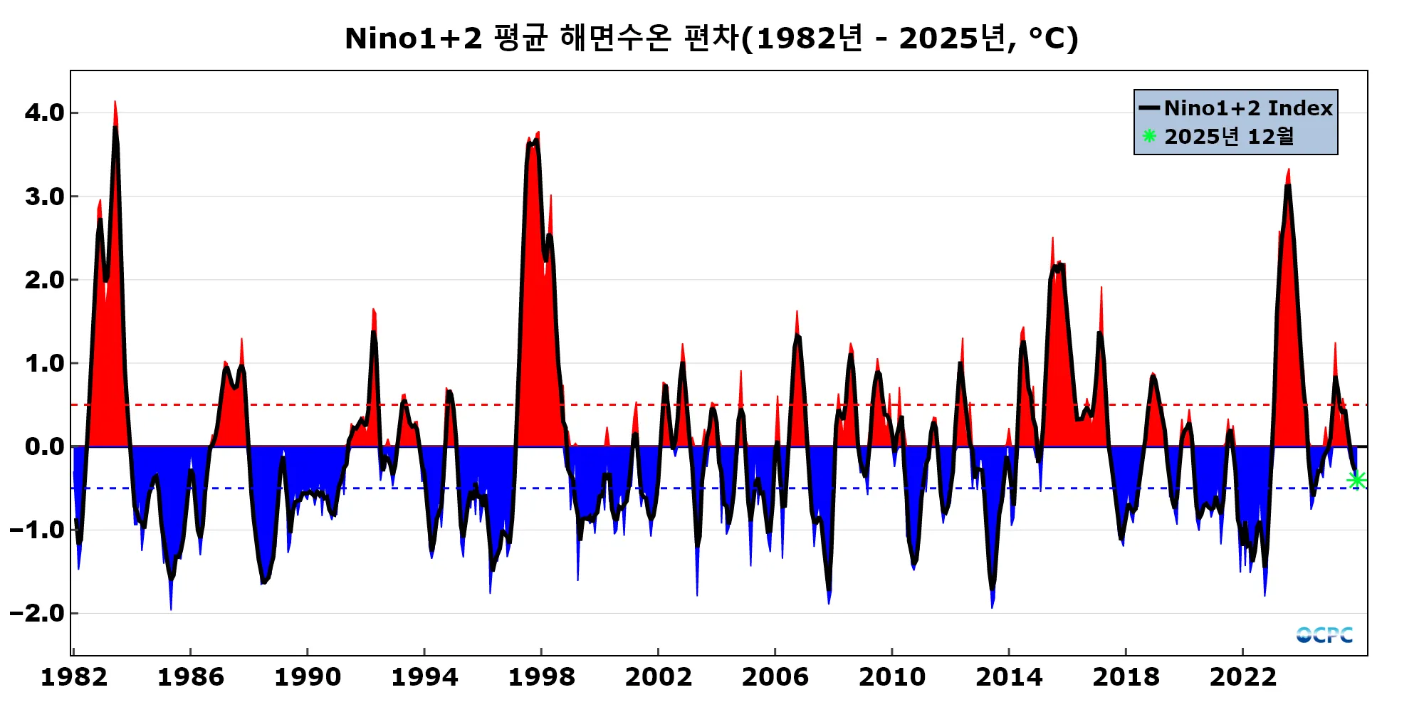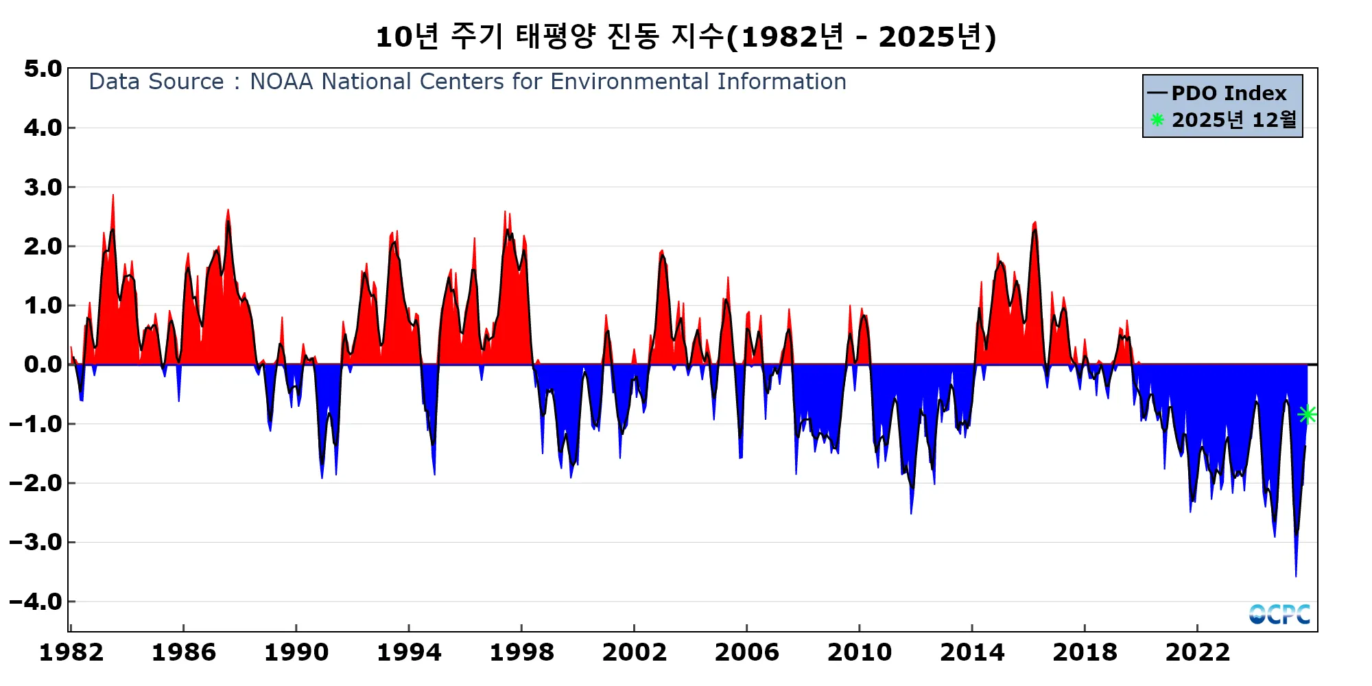 PDO는 미국 국립환경센터(NCEI, National Centers for Environmental Information)에서 제공하는 월 평균 자료(채색부분)와 이를 3개월 이동평균하여 나타낸 지수(검정선)입니다. OCPC 월간 분석정보에서는 당월 평균 지수만을 이용해서 잠정적으로 판정합니다.