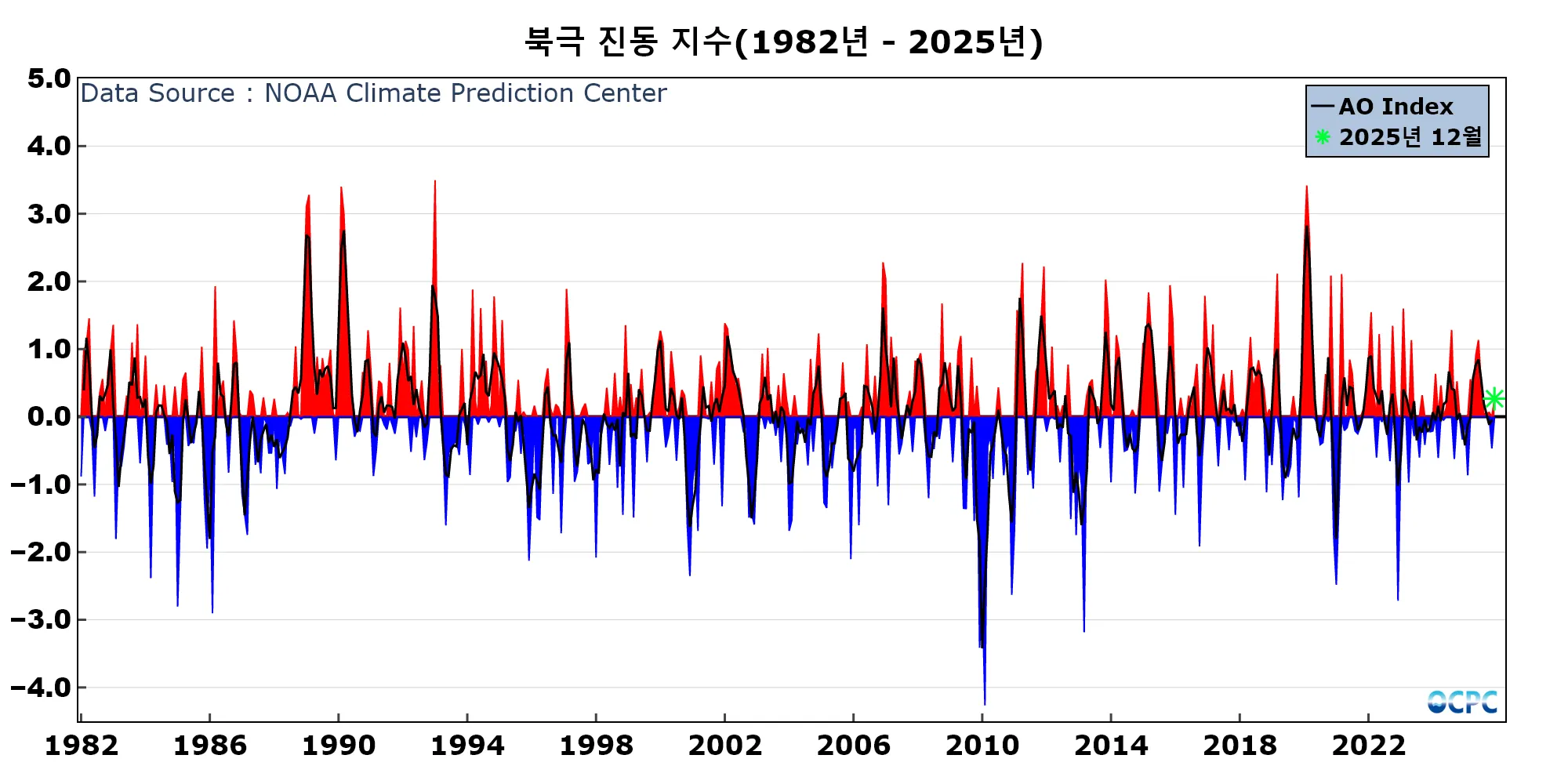 북극진동지수는 미국기후예측센터(CPC, Climate Prediction Center)에서 제공하는 월 평균 자료(채색부분)와 이를 3개월 이동평균하여 나타낸 지수(검정선)입니다. OCPC 월간 분석정보에서는 당월 평균 지수만을 이용해서 잠정적으로 판정합니다.