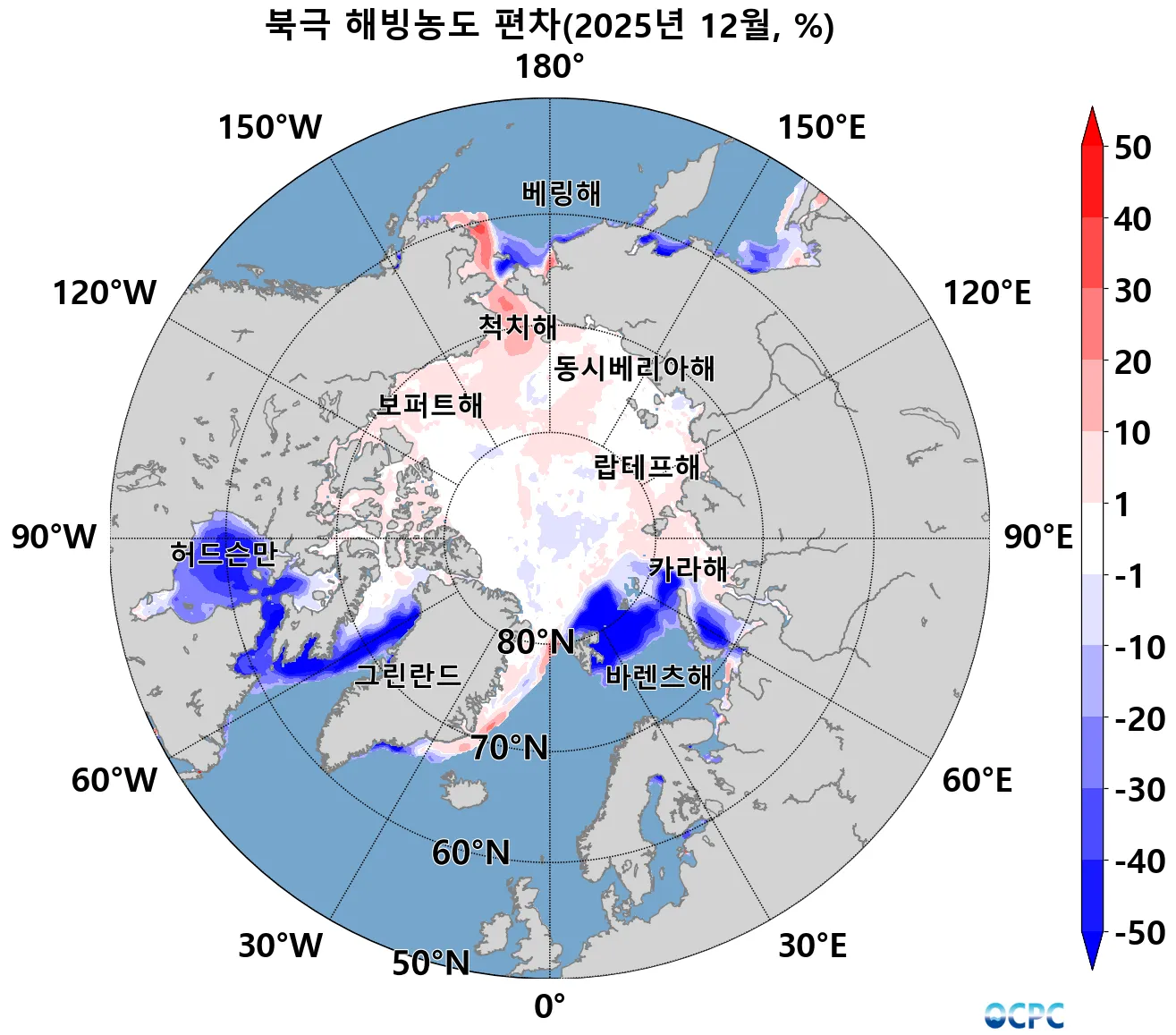 해빙농도 편차(당월·평년 해빙농도 15% 미만 해역 제외)
