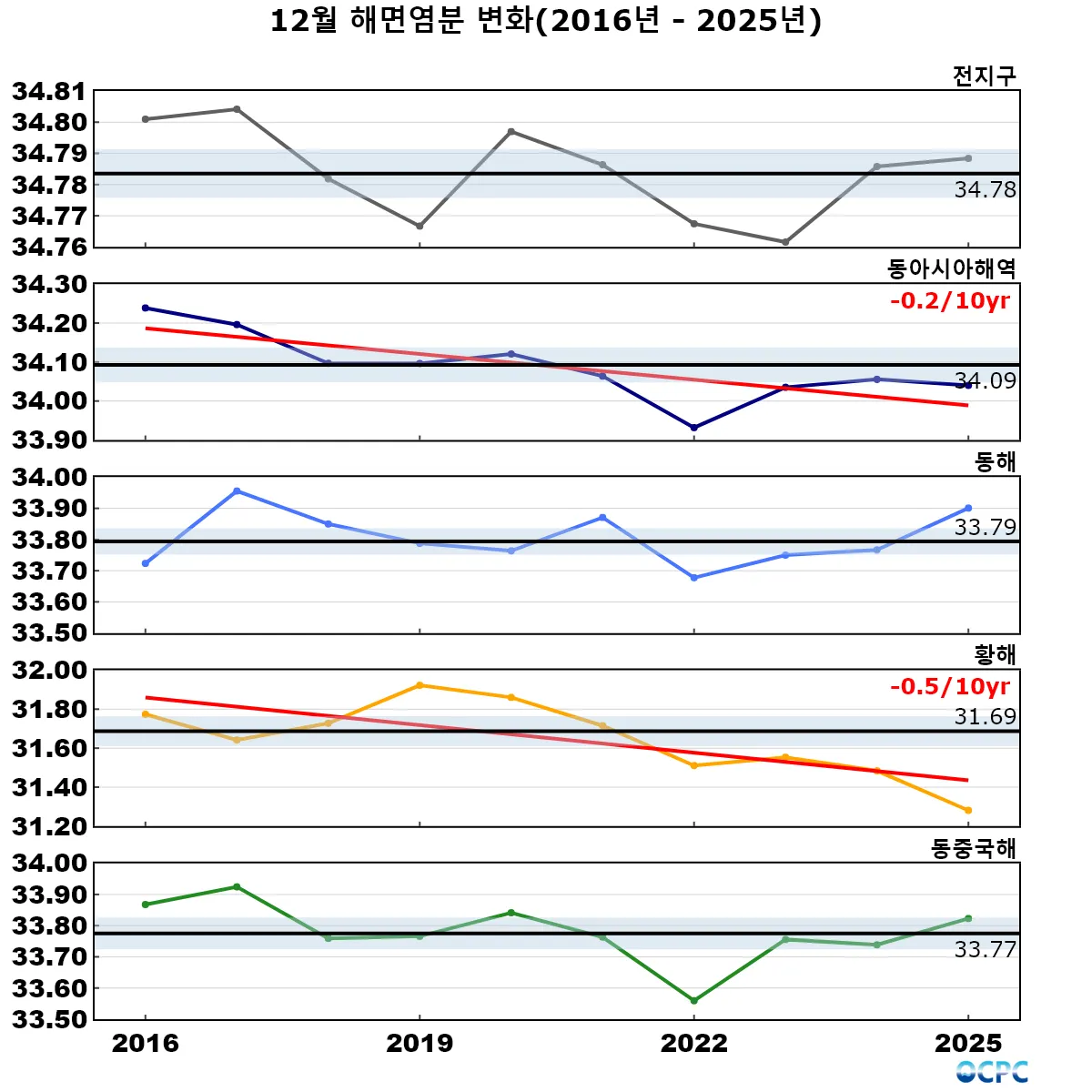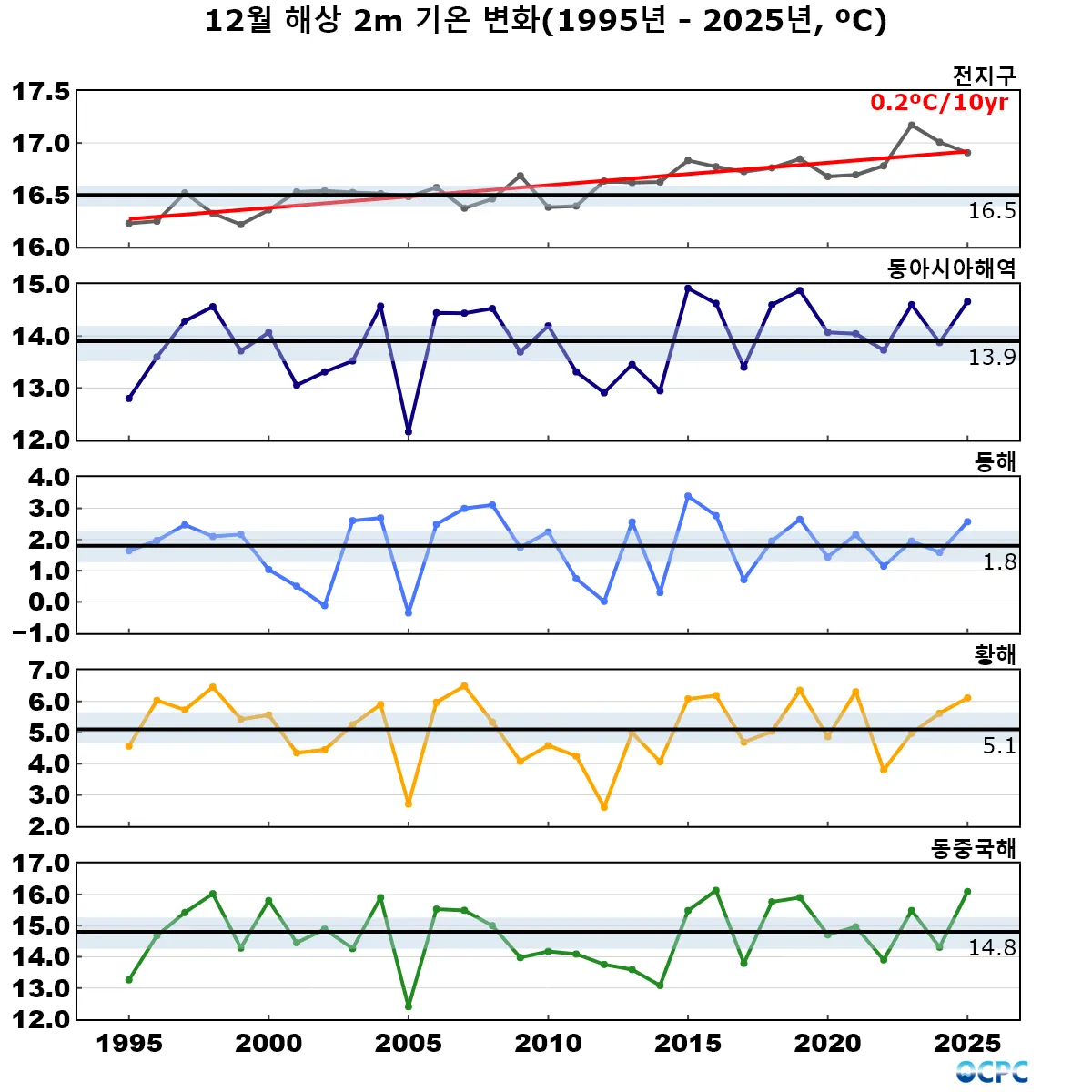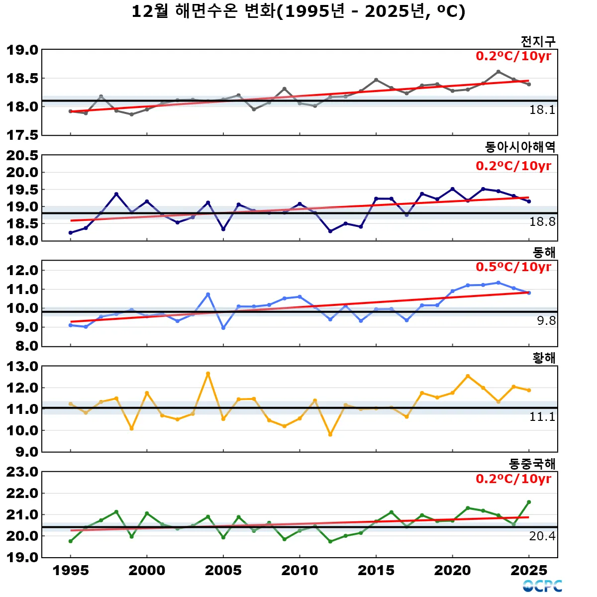 1995~2025년 동안 전지구 12월 해면수온은 10년에 0.2°C씩 증가하는 추세이며, 동아시아해역은 10년에 0.2~0.5°C씩 증가하는 추세로 그 중 동해의 상승률이 높습니다.