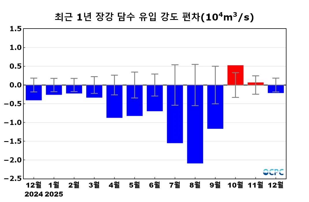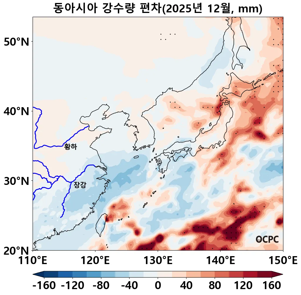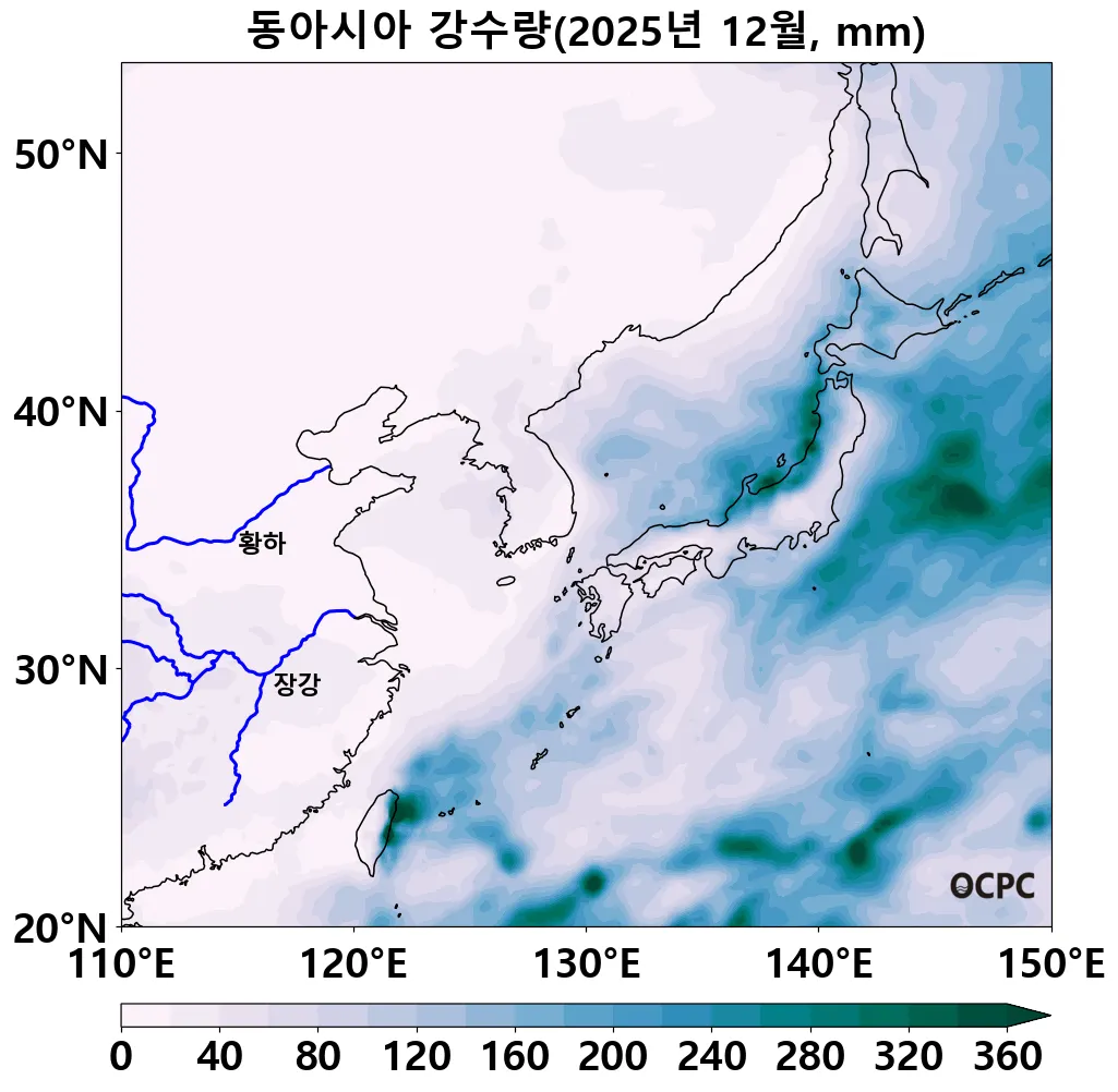 중국 장강 유역(105~122°E, 25~35°N)의 월 누적 강수량은 31.1mm로, 평년(46±15.3mm) 대비 약 32.4% 감소하였고, 연 누적 강수량도 평년 대비 5.8% 감소했습니다.