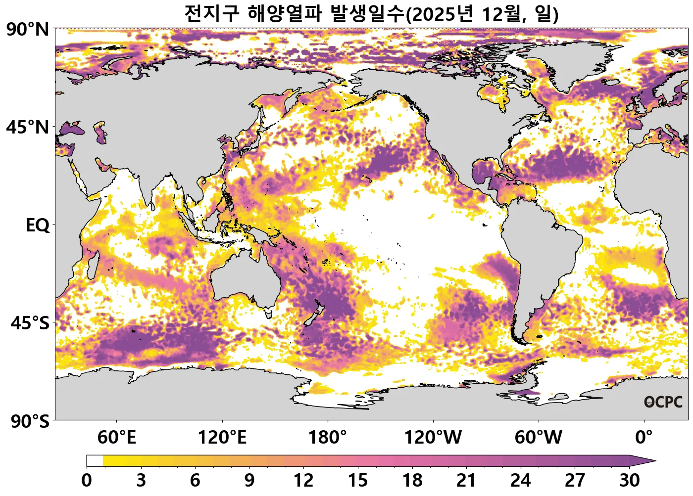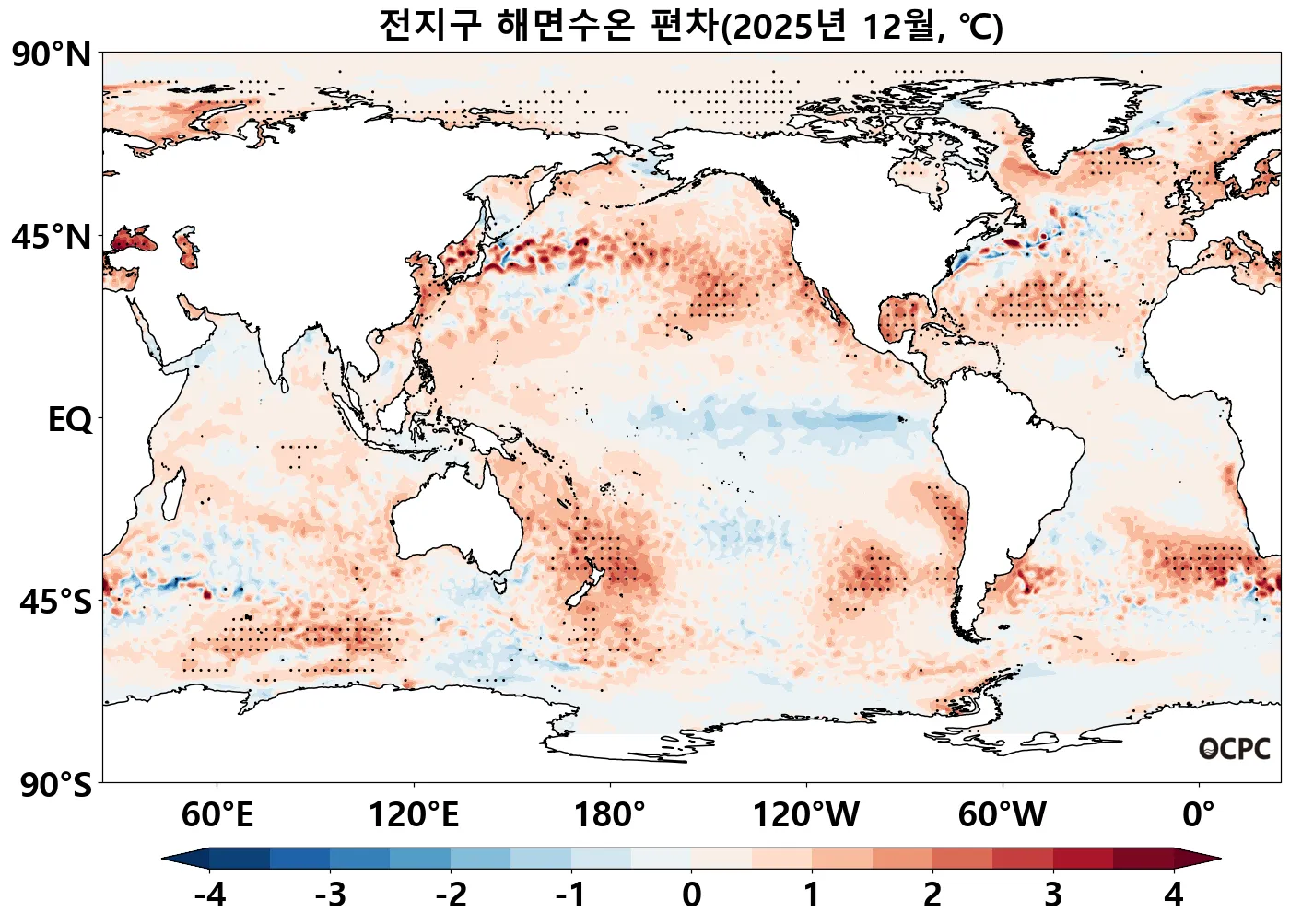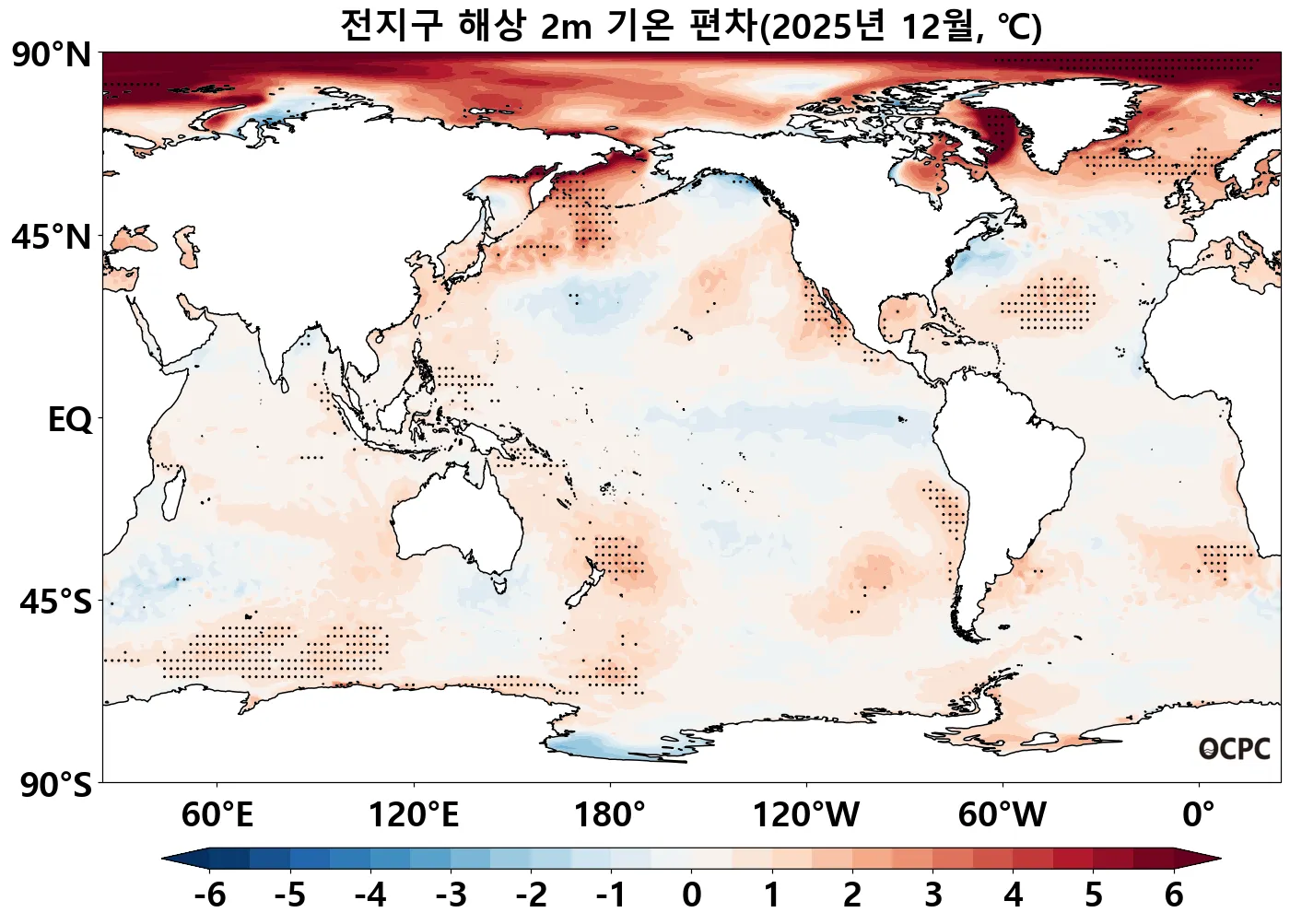 전지구 평균 해상기온은 평년(16.5±0.1°C)보다 0.4 °C 높았습니다. 이는 1995~2025년(12월) 중 세 번째로 높은 값입니다.