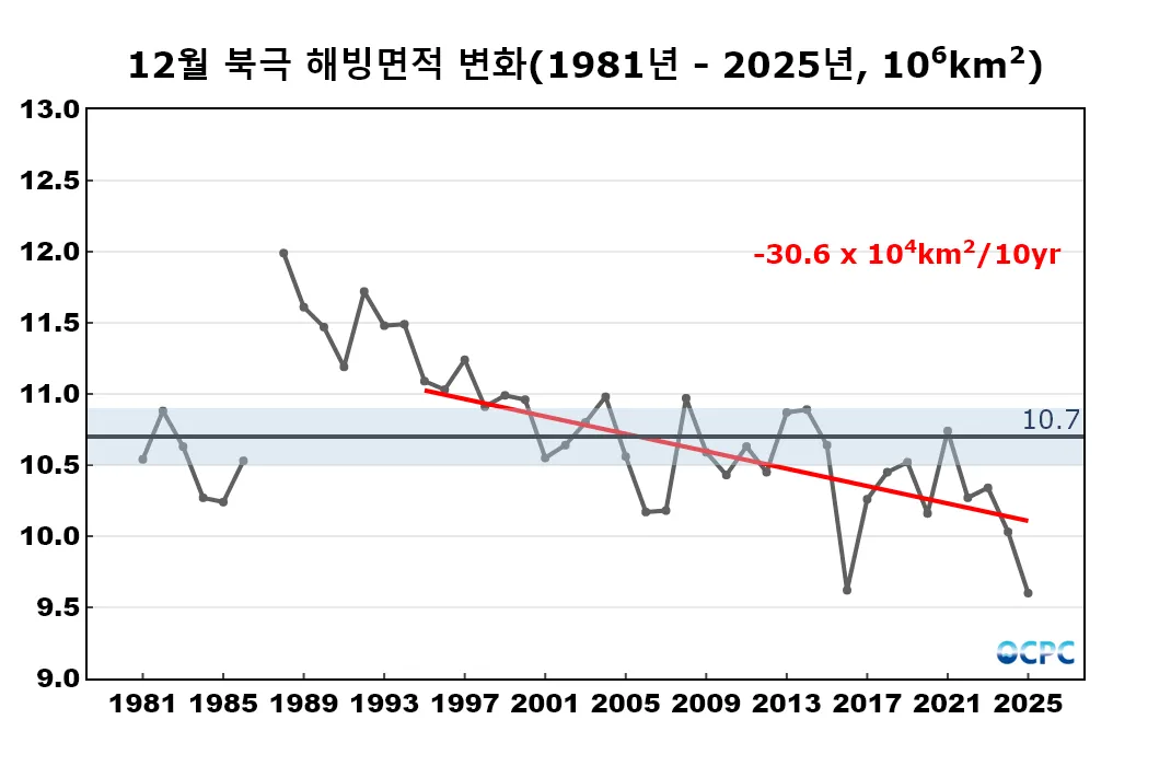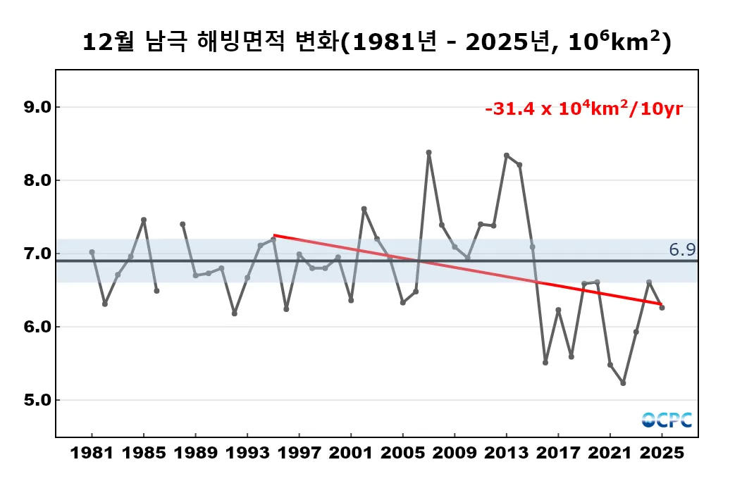 남극 해빙면적은 1995~2025년(12월)동안 10년에 약 31만km²씩 감소하는 추세입니다.