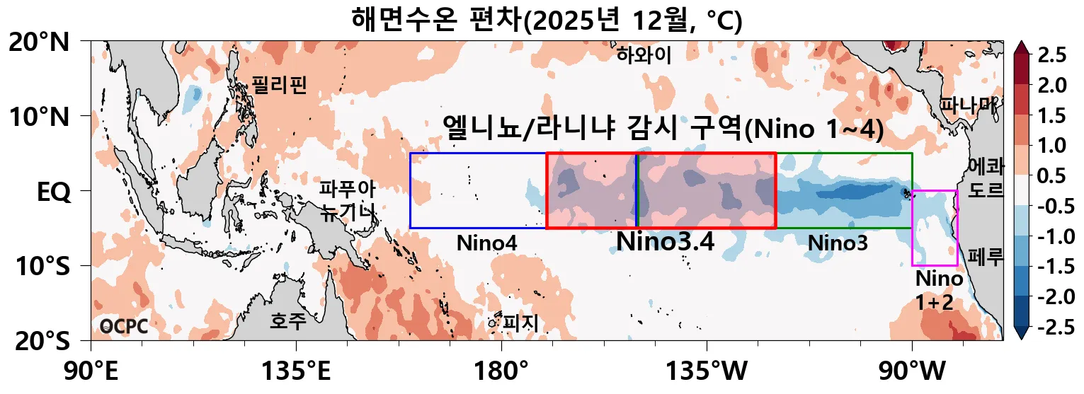 엘니뇨/라니냐 감시구역인 열대 태평양 Nino3.4 해역(5°S~5°N, 170°W~120°W)의 12월 평균 해면수온 편차는 -0.7°C로 라니냐 상태입니다.