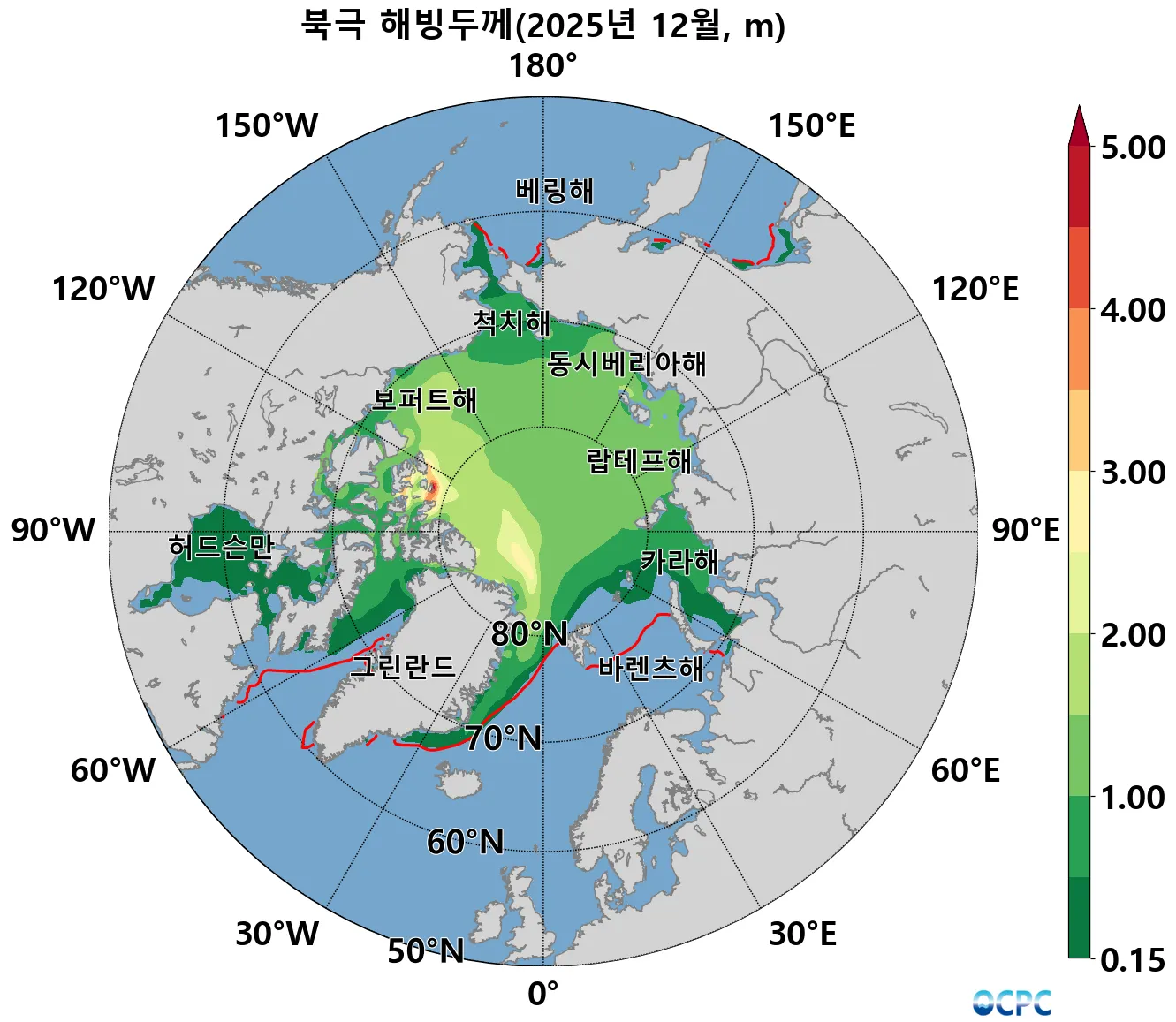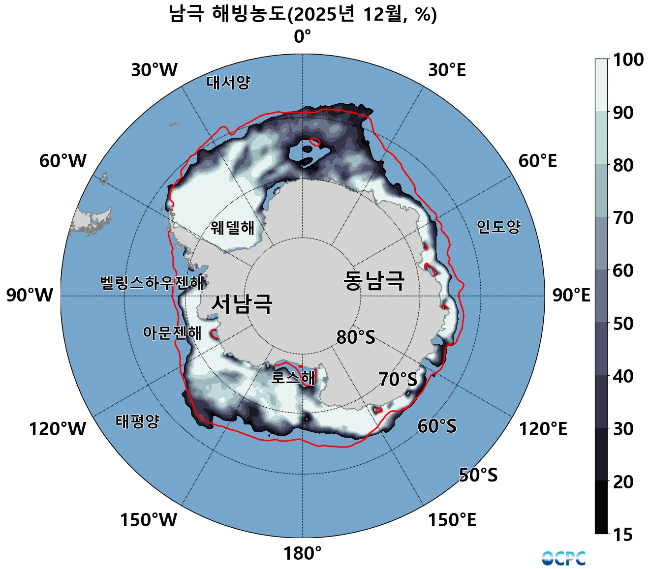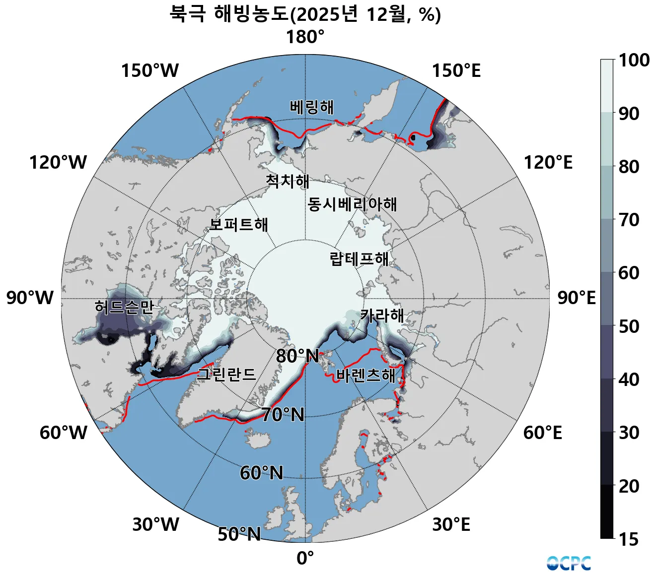 해빙농도 15% 이상 해역, 붉은선(평년 해빙농도 15% 경계)