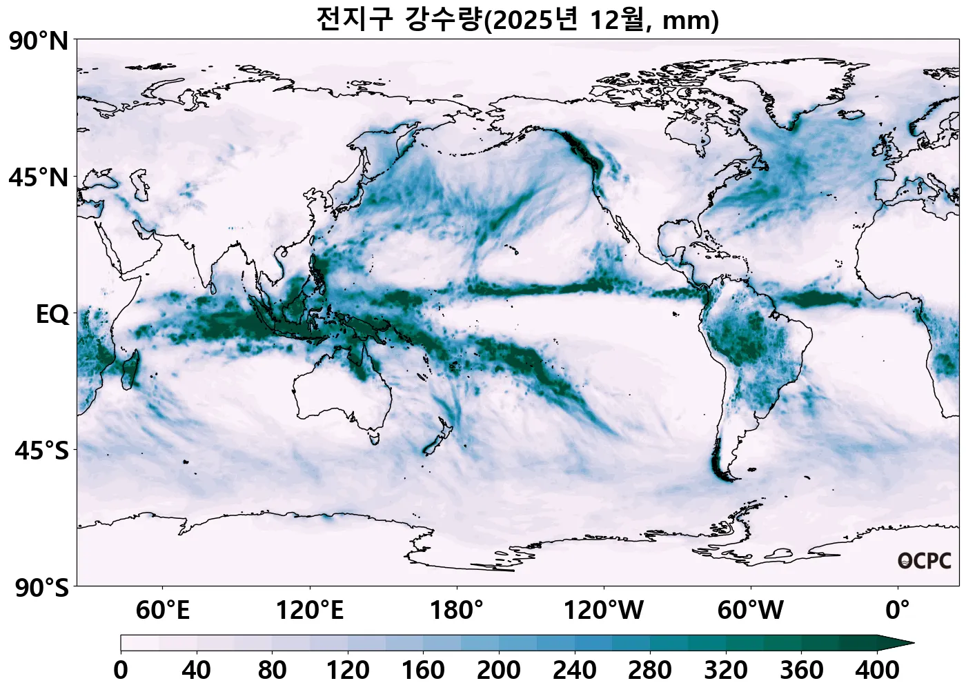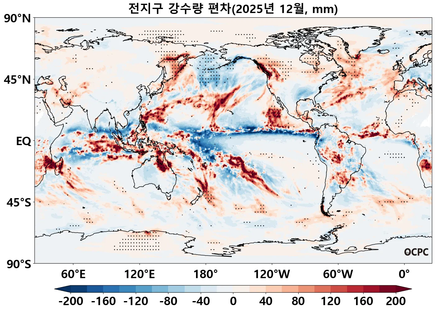 중태평양에서 음의 강수 편차가 나타나는 라니냐 시기의 강수 반응이 나타났습니다. 서태평양의 강수는 8~11월에 비해 상대적으로 약했습니다.